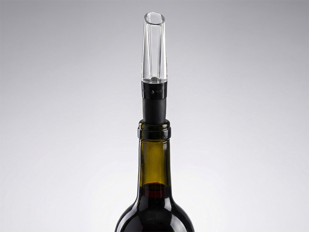 Силиконовая вставка отвечает за плотное прилегание к горлышку бутылки, а прозрачная акриловая вставка позволяет насладиться видом разливающегося вина.