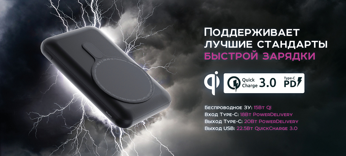 Особенности: PowerBank поддерживает технологию MagSafe и примагничивается к девайсам либо к чехлам, обладающими этой технологией; поддерживает новейшие технологии быстрой зарядки: PowerDelivery и QuickCharge 3.0; возможность использования со смартфонами без поддержки технологии MagSafe