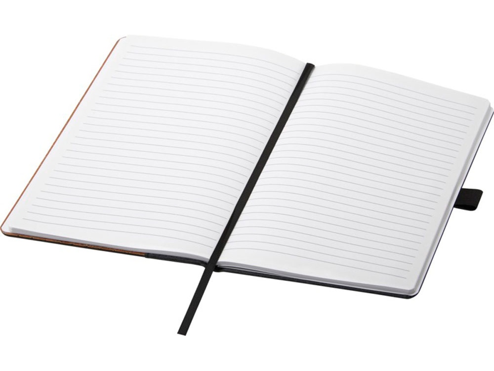 Блокнот формата А5 с бамбуковой обложкой и корешком из регенерированной кожи. 80 листов, линованная переработанная бумага плотностью 80 г/м2, черная петля для ручки, эластичная резинка и ленточка-закладка. Бамбуковое дерево.