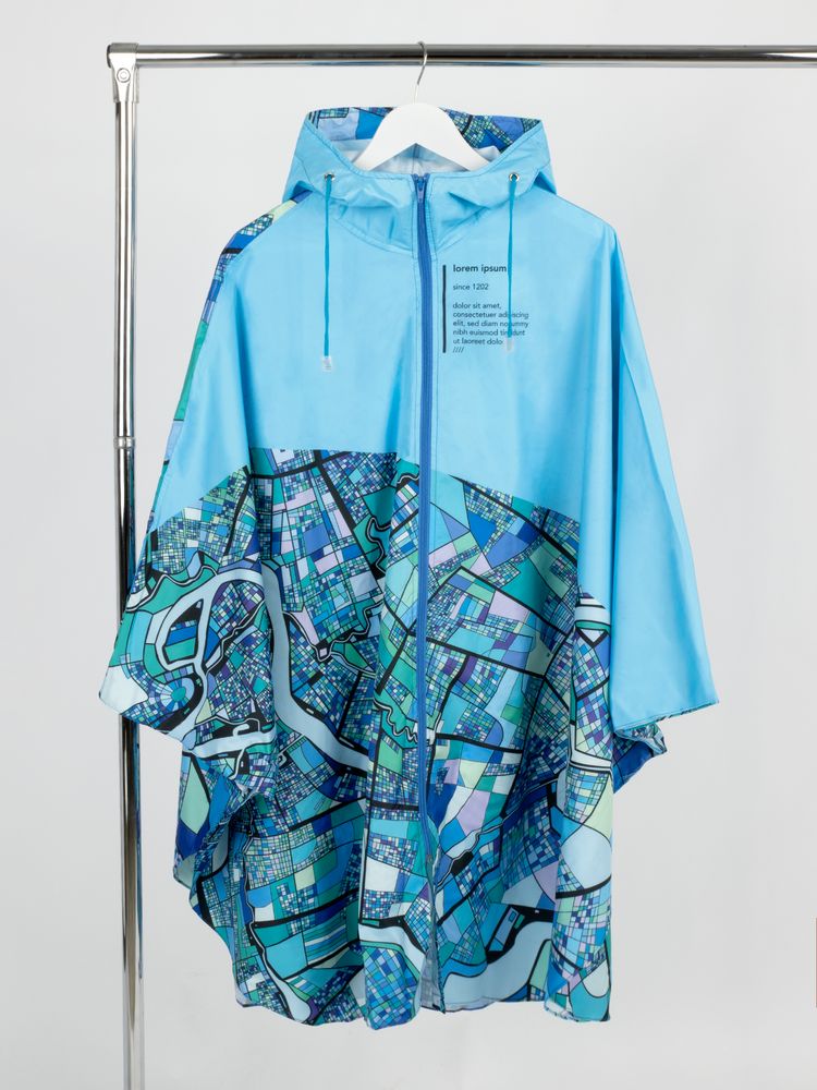 Легкий городской дождевик-пончо с регулируемым капюшоном из влагоустойчивого материала подходит для защиты в непогоду, свободно одевается поверх одежды и небольшого рюкзака.