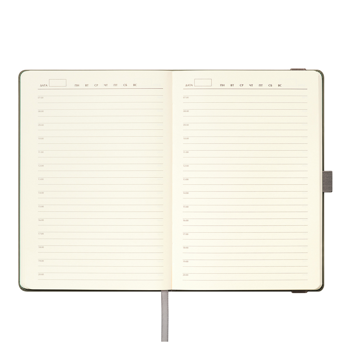Страницы теплого кремового оттенка с легкой шелковистостью и скругленными уголками радуют глаз и приятны на ощупь. Матовый срез в тон страниц дополняет гармоничный образ. Атласное ляссе, подобранное в тон обложке, с легким блеском и шелковистой текстурой поможет вам быстро найти нужную страницу.