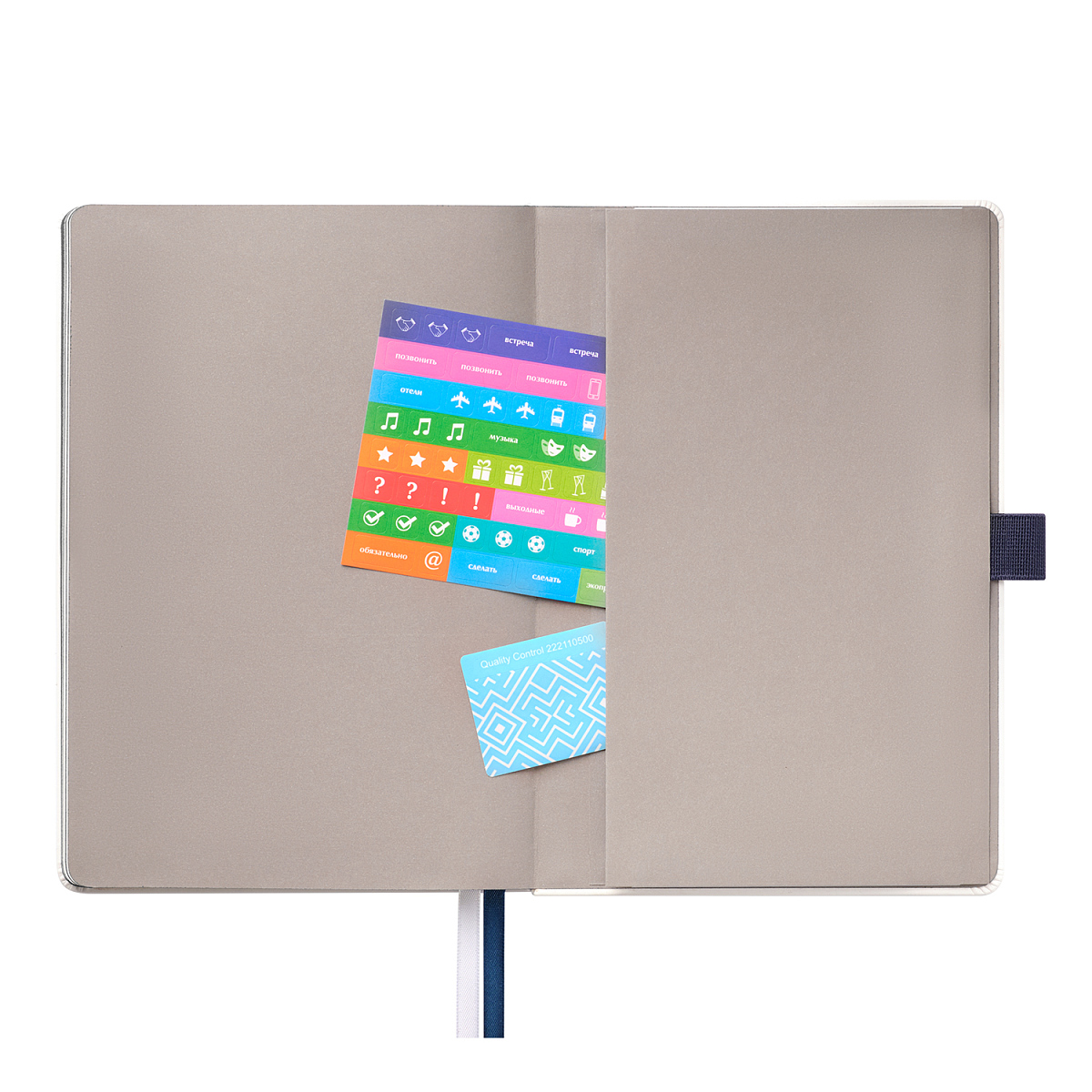 Недатированный ежедневник выполнен в жесткой обложке из искусственной кожи со скругленными уголками. Переплетный материал гладкий, с легкой естественной паутинкой морщин, имеет полуглянцевый блеск. Цвет – чистый белый. Черные матовые форзац и нахзац, а также черный срез блока создают оригинальный динамичный цветовой ансамбль и подчеркивают белизну обложки. Страницы светло-кремового цвета, из гладкого офсета, слегка шелковистые, со скругленными уголками. Добавляют изделию мягкую комфортную теплоту. Двойное атласное ляссе составлено из черной и белой лент. Каждая шириной 6 мм, имеет легкий блеск. Вертикальная фиксирующая резинка прочная, надежная и удобная, в тон срезу. Есть петелька для ручки в тон резинки. Карман на заднем форзаце.