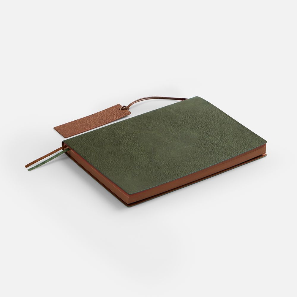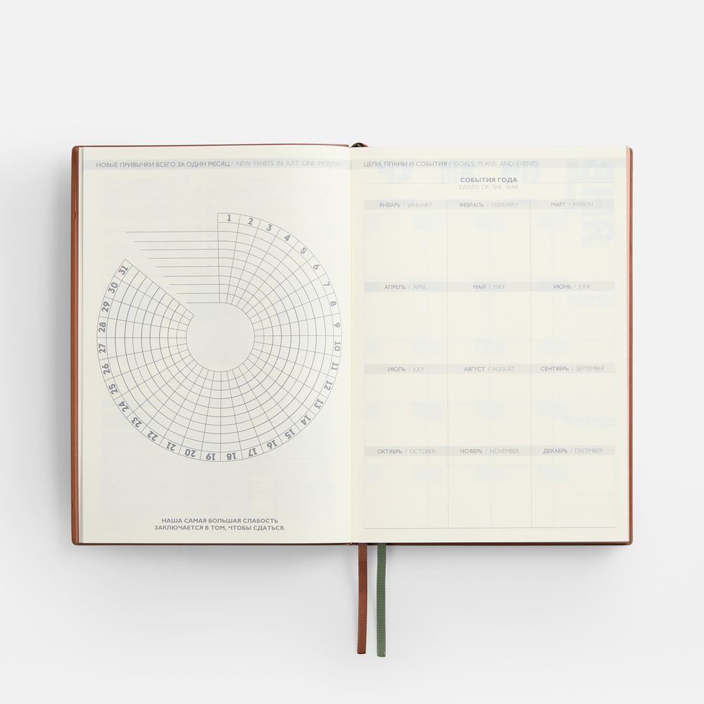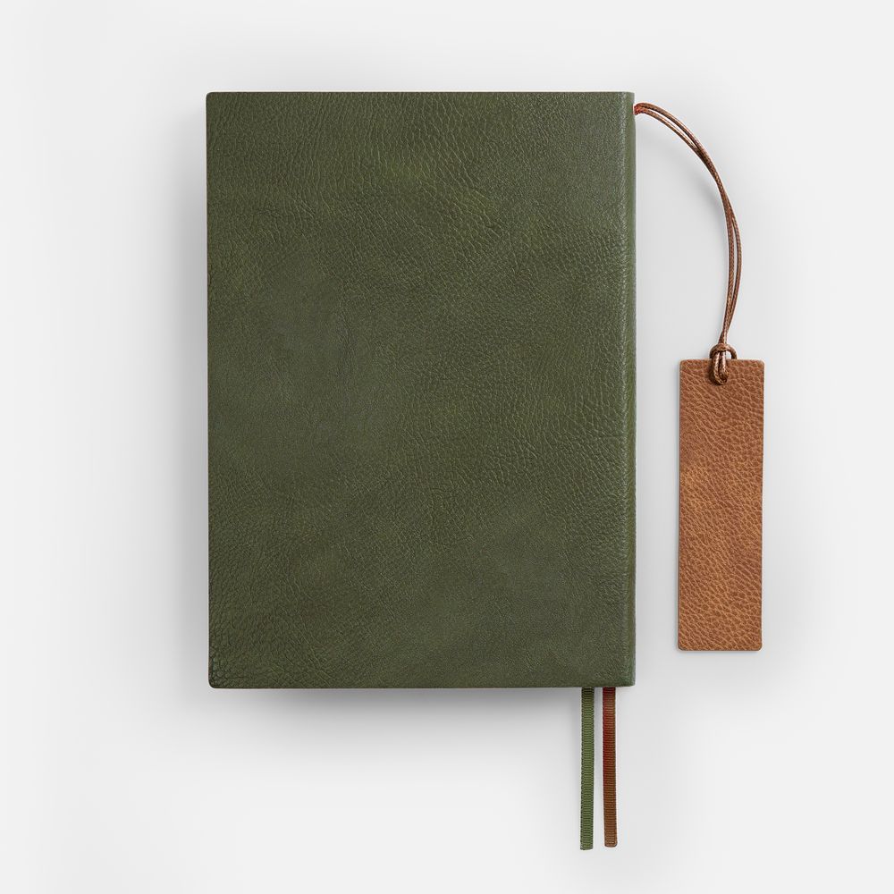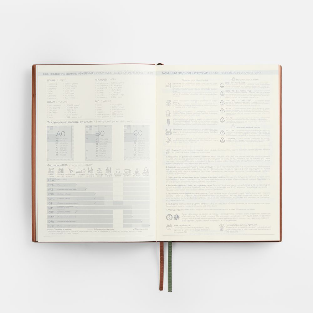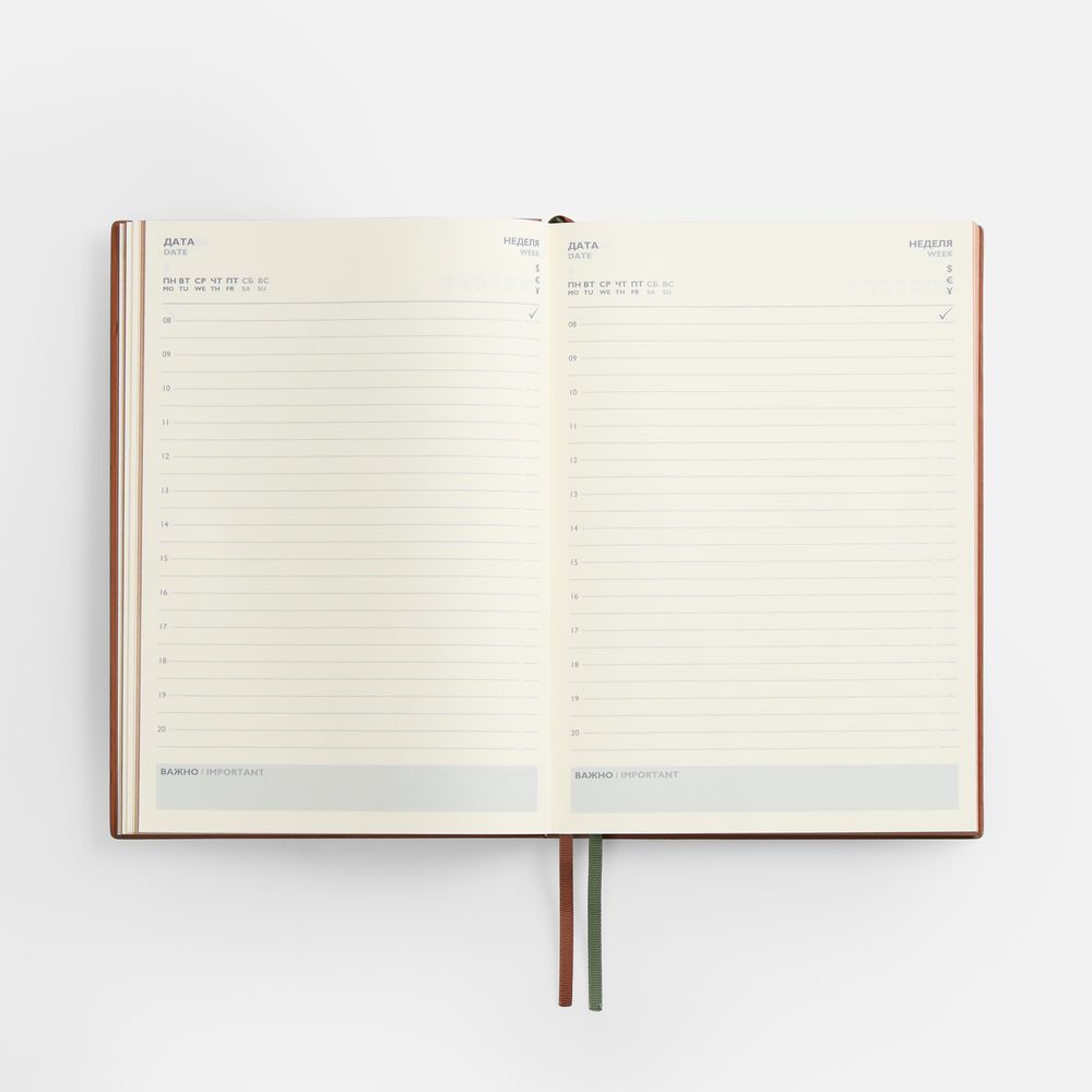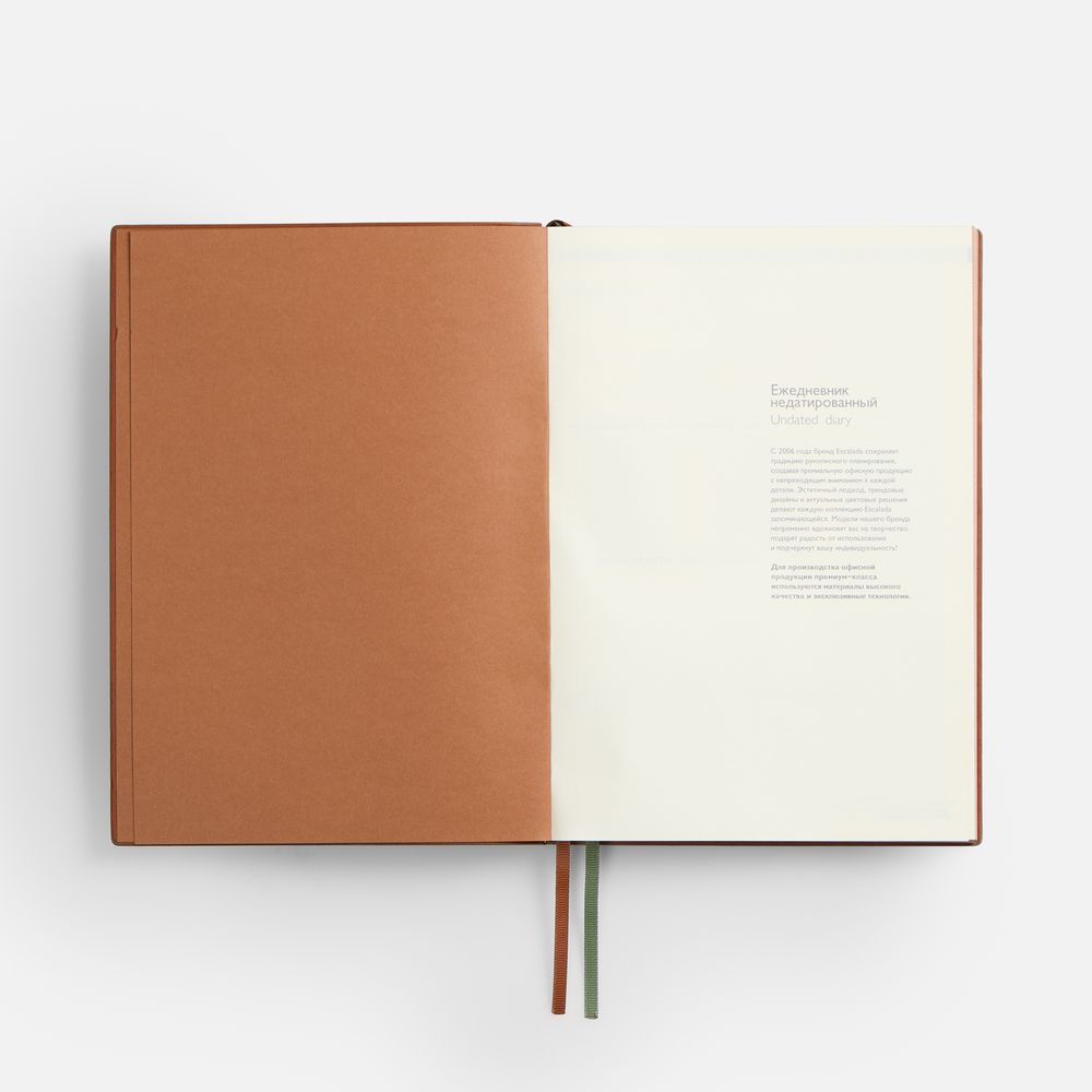 Ежедневник с гибкой обложкой и закладкой из искусственной кожи, дополнен капталом и двойным ляссе.