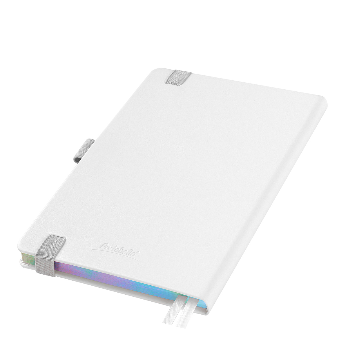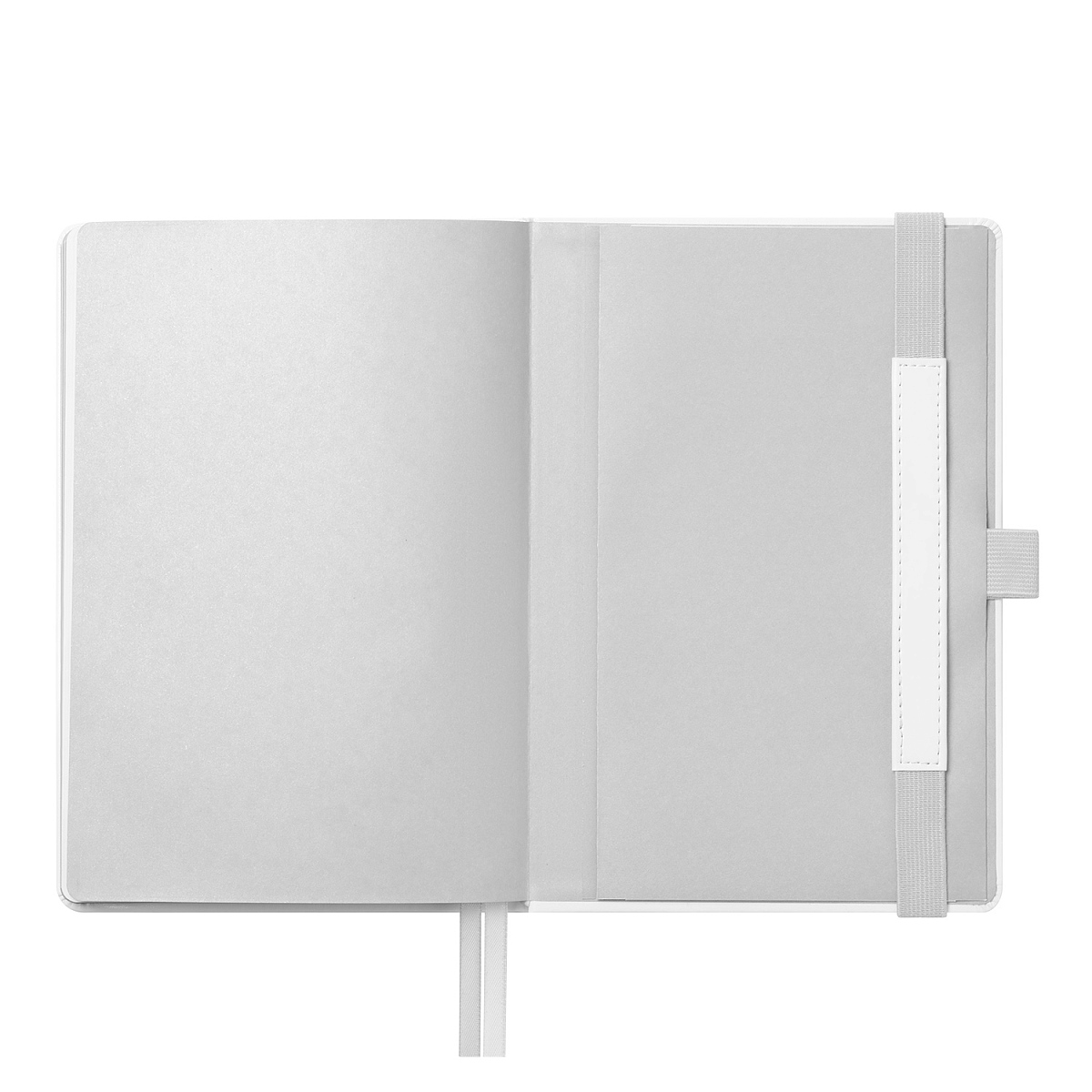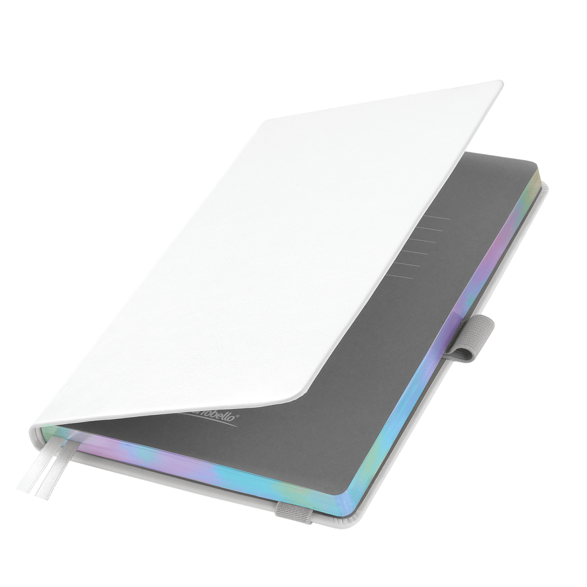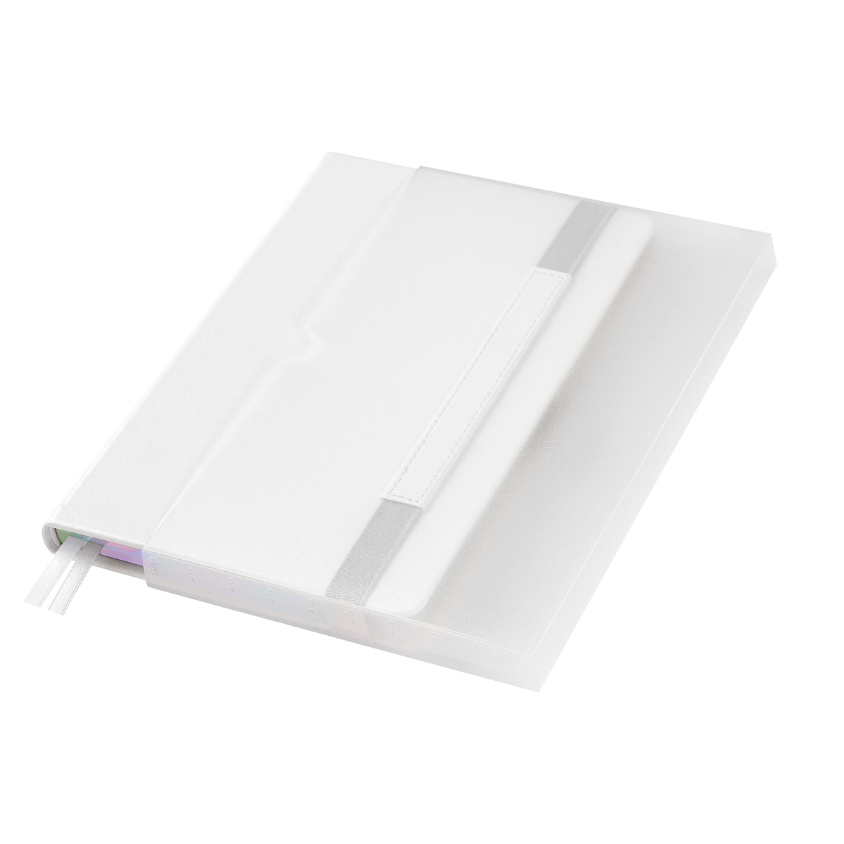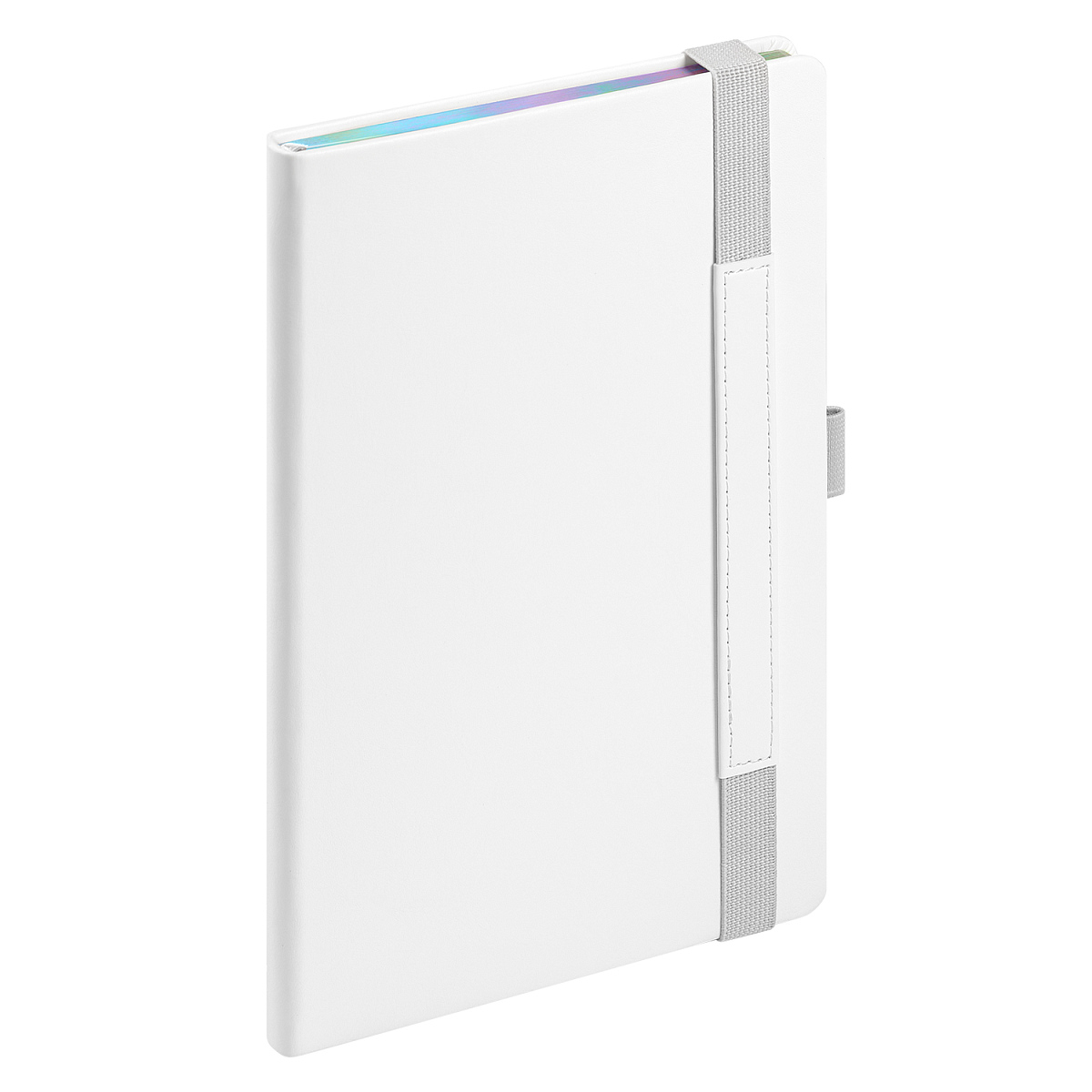 Недатированный ежедневник в жесткой обложке из качественной искусственной кожи. Материал обложки гладкий, текстурированный, с полуглянцевым блеском. Скругленные углы обложки и внутреннего блока. Отличительная особенность коллекции — голографический фольгированный срез блока. Форзац/нахзац– серые. Вариант в жесткой обложке украшен широкой вертикальной резинкой-фиксатором с вставкой из ПУ-материала обложки и петелькой под ручку, а также двойным ляссе (серым и в тон обложки).