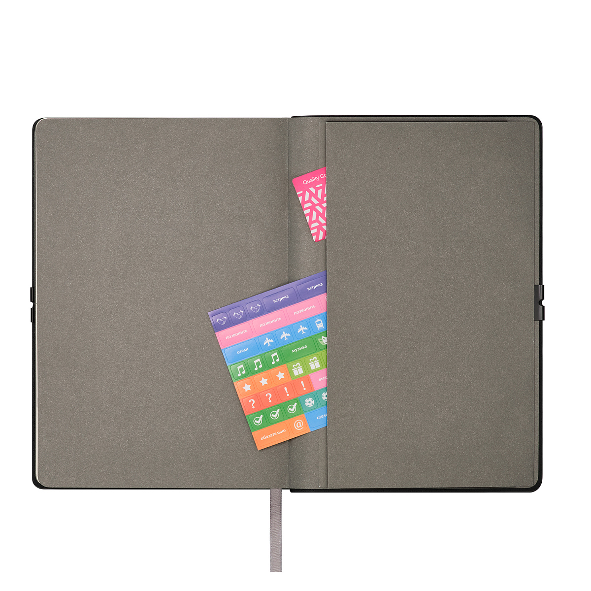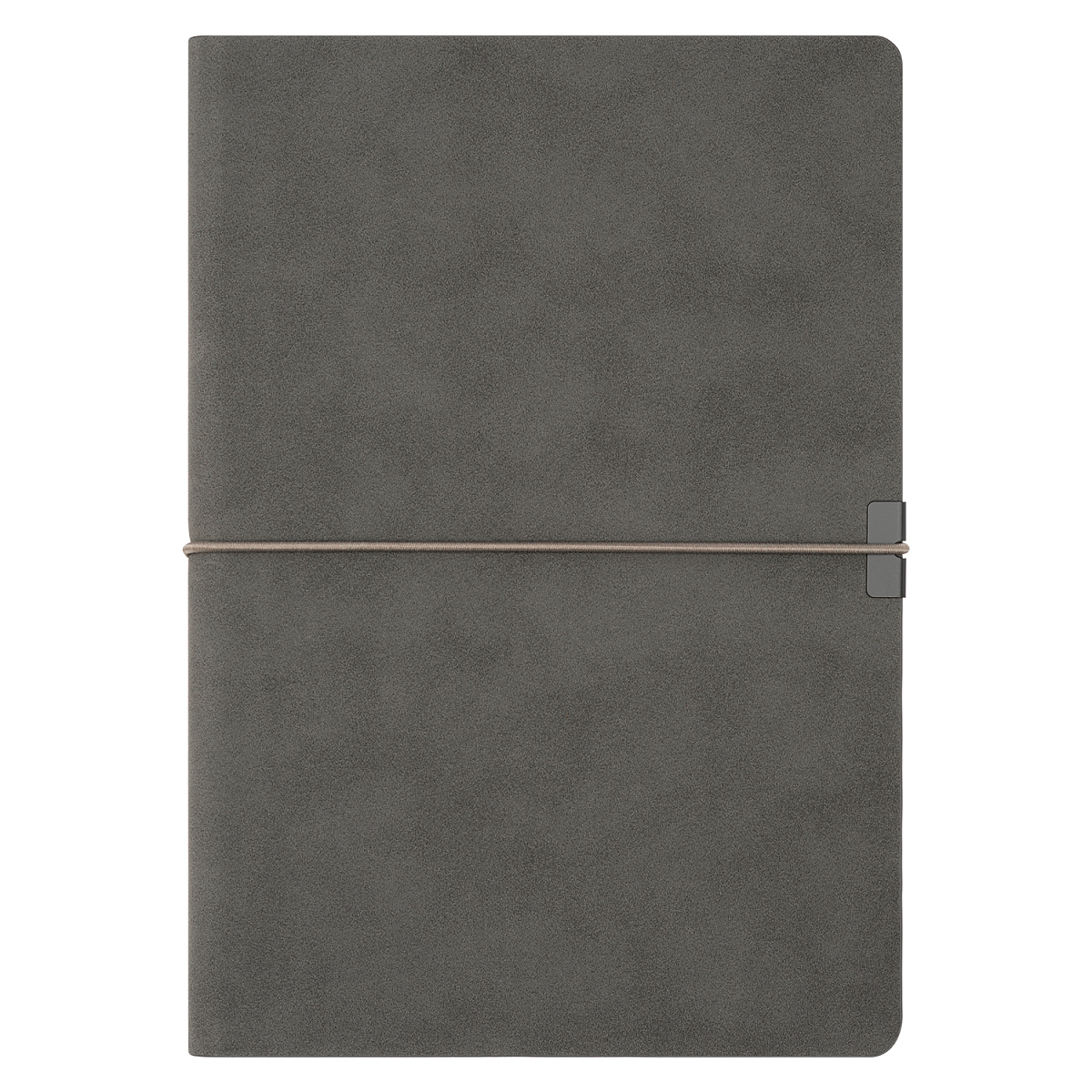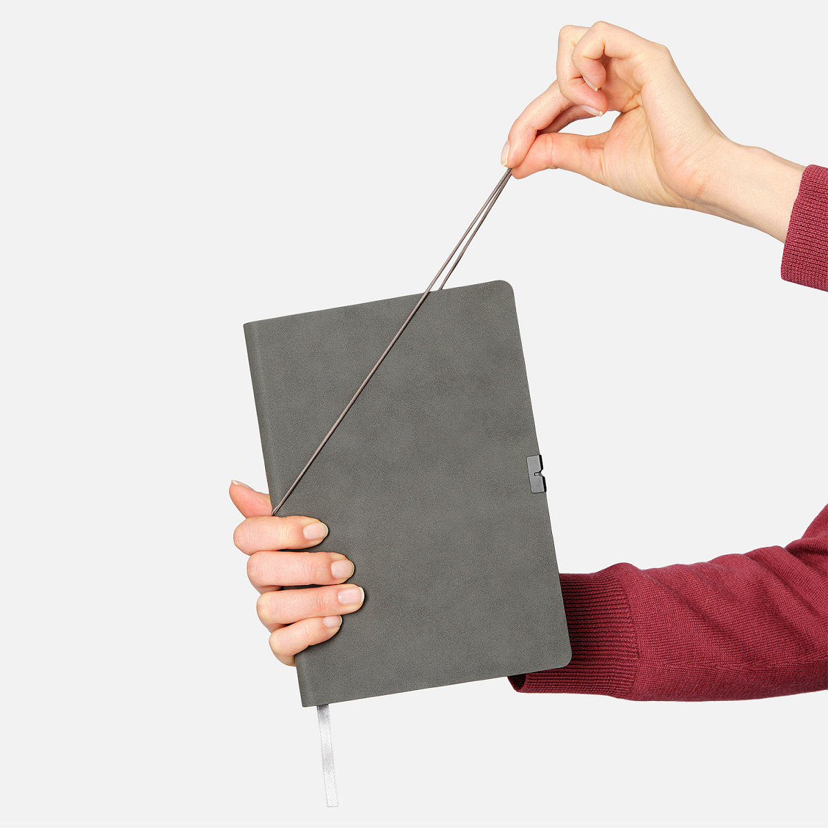 Горизонтальная резинка, фиксирующая обложку, дополнена металлическими элементами, которые не только защищают обложку от повреждений, но и служат стильным акцентом. Матовый срез в тон обложки и светло-кремовые страницы из гладкого, слегка шелковистого офсета подчеркивают изысканность дизайна. Атласное ляссе гармонично завершает образ этого элегантного ежедневника.
