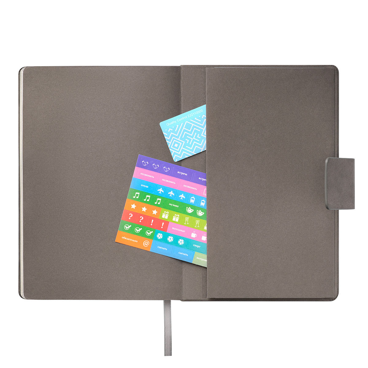 Оригинальный квадратный магнитный клапан надежно фиксирует обложку. Внутри — кремовые страницы из гладкого шелковистого офсета со скругленными уголками, форзац и нахзац, а также срез в тон обложки, создают гармоничное сочетание. Элегантное атласное ляссе дополняет изысканный образ.