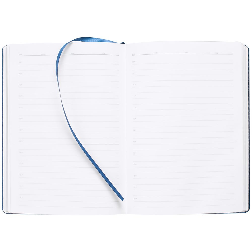 Ежедневник с твердой обложкой и серебристым обрезом, выполнен из материала Saffian, синий НН, дополнен ляссе в цвет обложки.