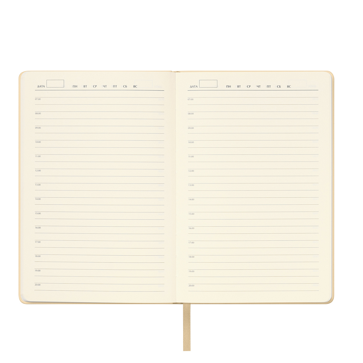 Матовое покрытие Soft Touch с деликатным пудровым эффектом подарит неповторимое тактильное удовольствие. А кремовые форзац, нахзац и срез блока создадут гармоничное обрамление для гладких шелковистых страниц кремового оттенка. Элегантное атласное ляссе поможет вам легко ориентироваться в записях.