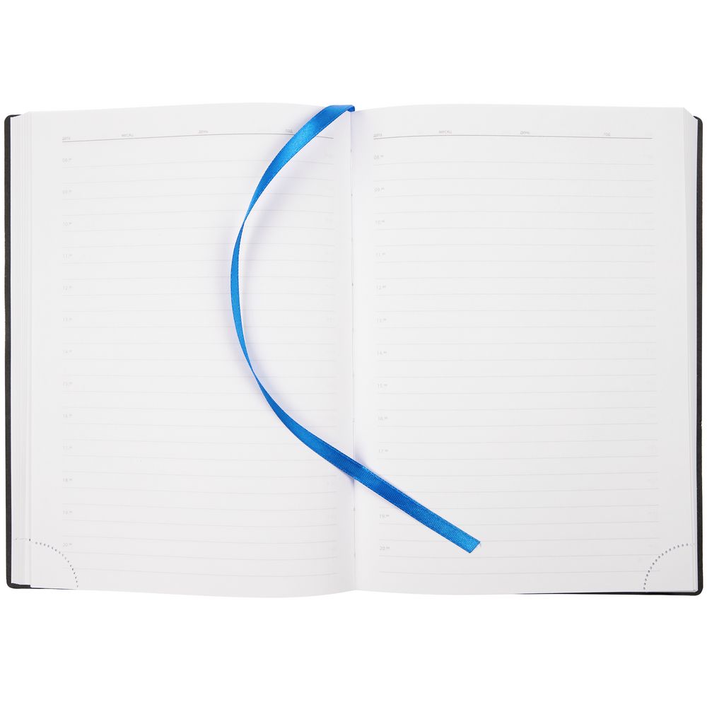 Ежедневник с гибкой обложкой выполнен из материала Latte, черный АА, и дополнен резинкой шириной 1 см, капталом и ляссе черного цвета.