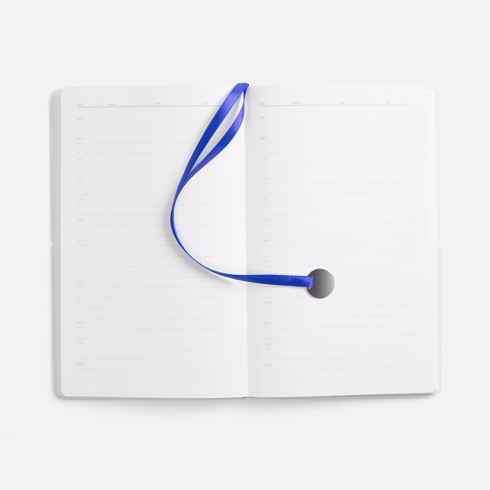 Ежедневник с гибкой обложкой, выполнен из материала Waltz, белый BB, дополнен ляссе в цвет обложки с металлическим шильдом.