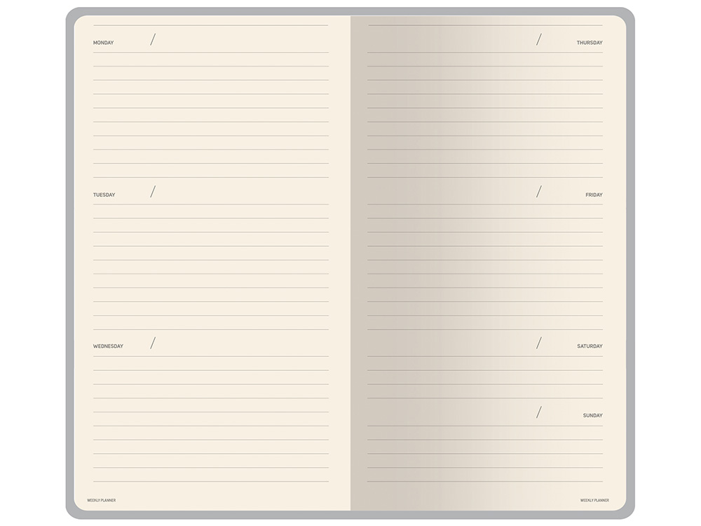 Внутри — недатированный блок формата А6 (84×160 мм) на бежевой бумаге 80 г/м². Книжный переплёт хорошо раскрывается, а скруглённые углы одновременно придают еженедельнику премиальный вид и защищают края при носке. Ляссе‑закладка выполнена в цвет обложки и помогает быстро находить нужную страницу.