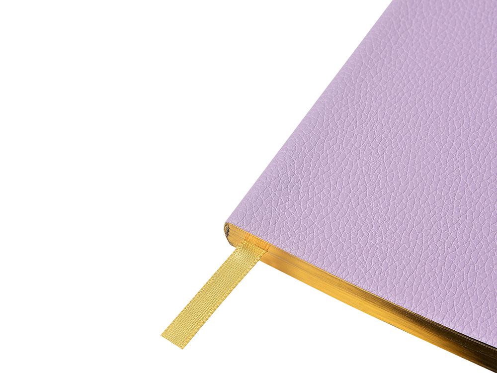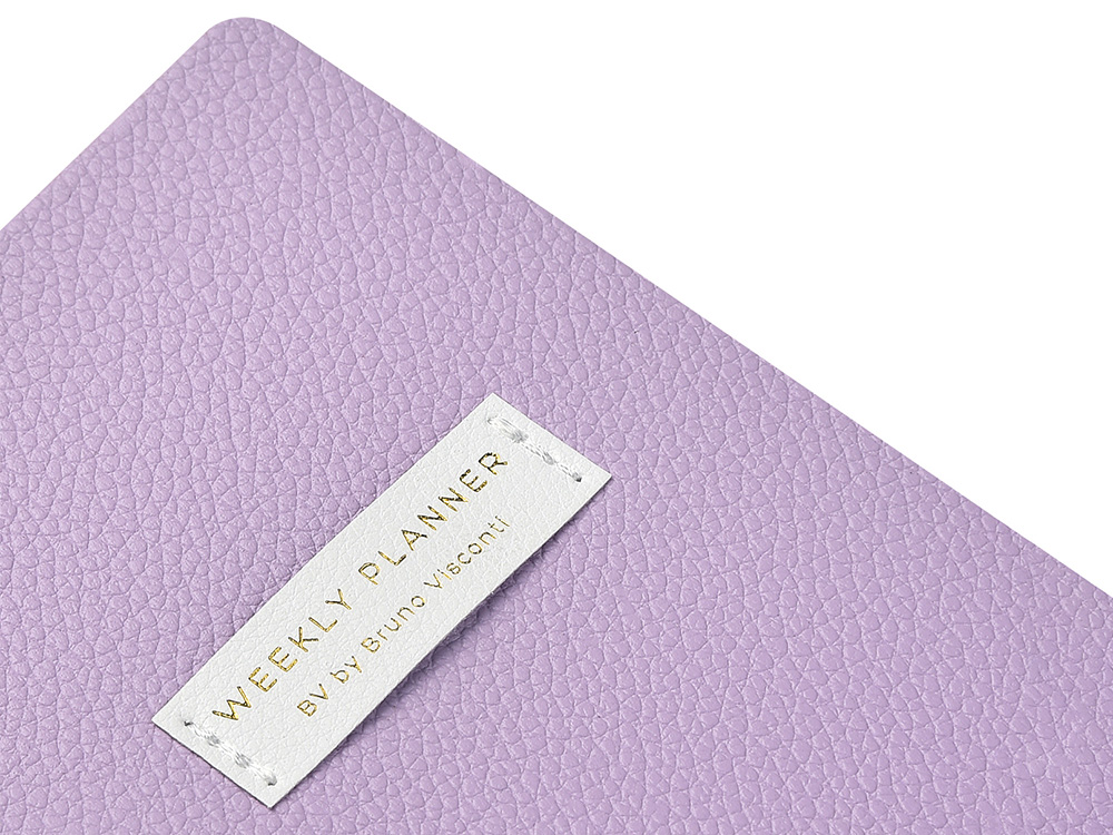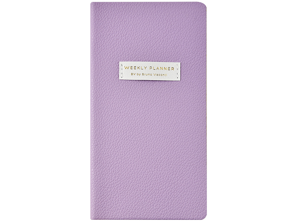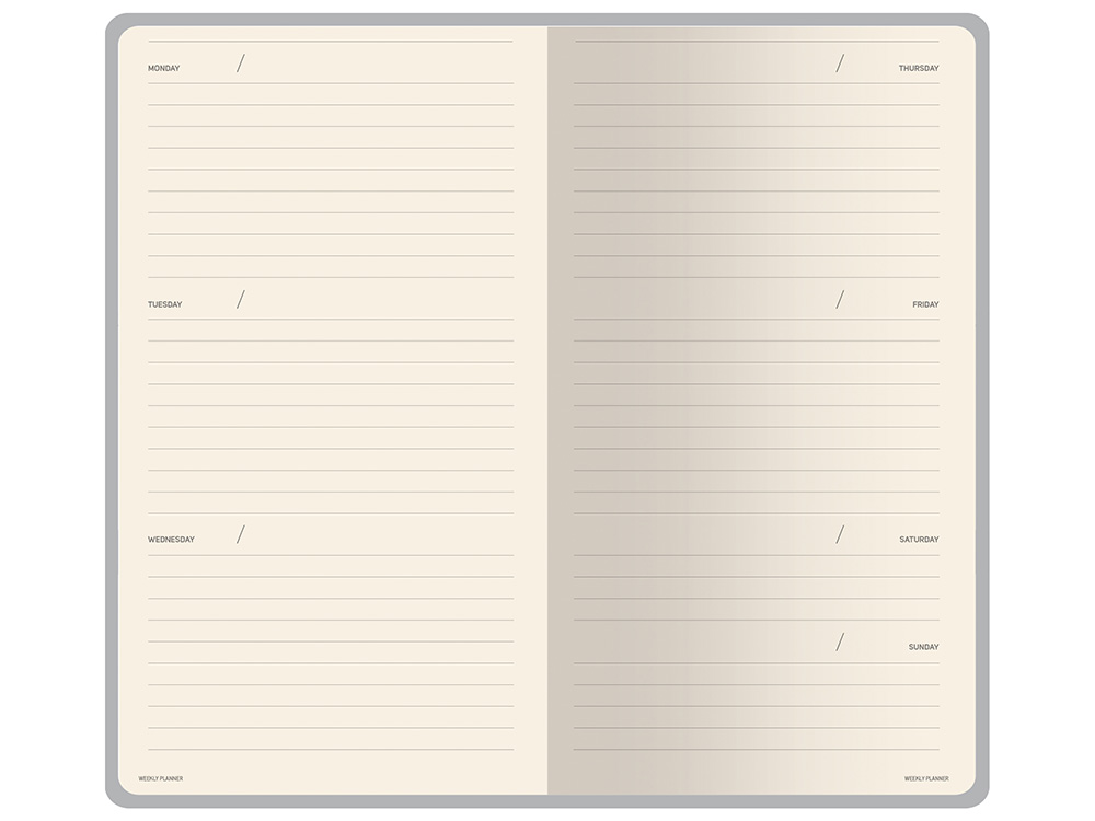 Внутри — недатированный блок формата А6 (84×160 мм) на бежевой бумаге 80 г/м². Книжный переплёт хорошо раскрывается, а скруглённые углы одновременно придают еженедельнику премиальный вид и защищают края при носке. Ляссе‑закладка выполнена в цвет обложки и помогает быстро находить нужную страницу.
