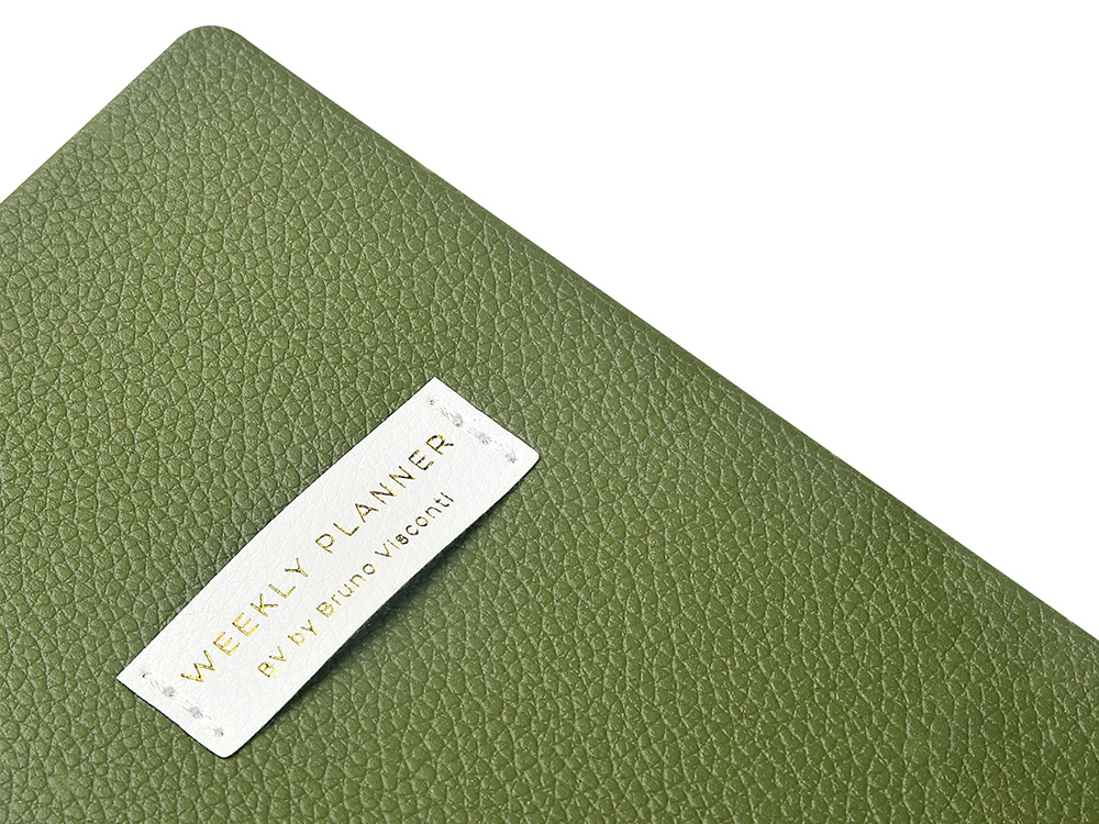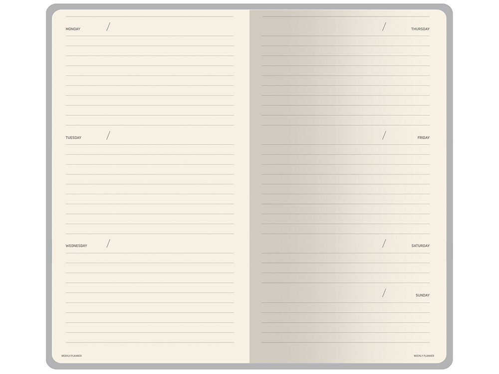 Внутри — недатированный блок формата А6 (84×160 мм) на бежевой бумаге 80 г/м². Книжный переплёт хорошо раскрывается, а скруглённые углы одновременно придают еженедельнику премиальный вид и защищают края при носке. Ляссе‑закладка выполнена в цвет обложки и помогает быстро находить нужную страницу.
