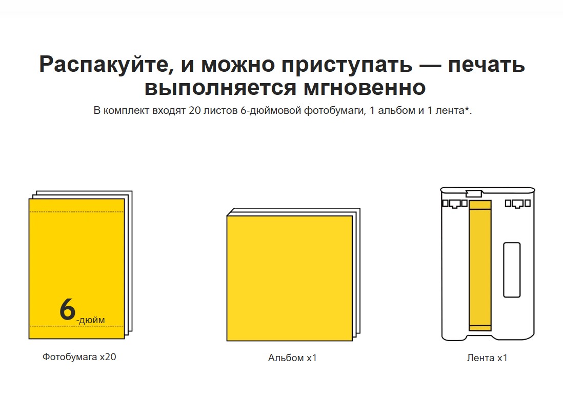 Комплектация: 10 листов 6-дюймовой фотобумаги, 10 листов 3-дюймовой фотобумаги на клейкой основе и 1 лента