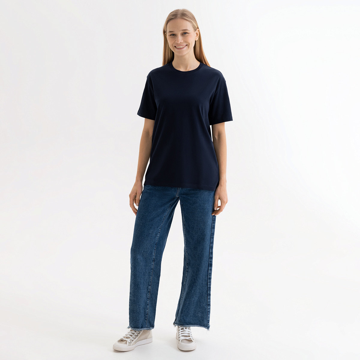 За счет продуманного кроя футболка идеально садится на разные типы фигур, создавая аккуратный силуэт.