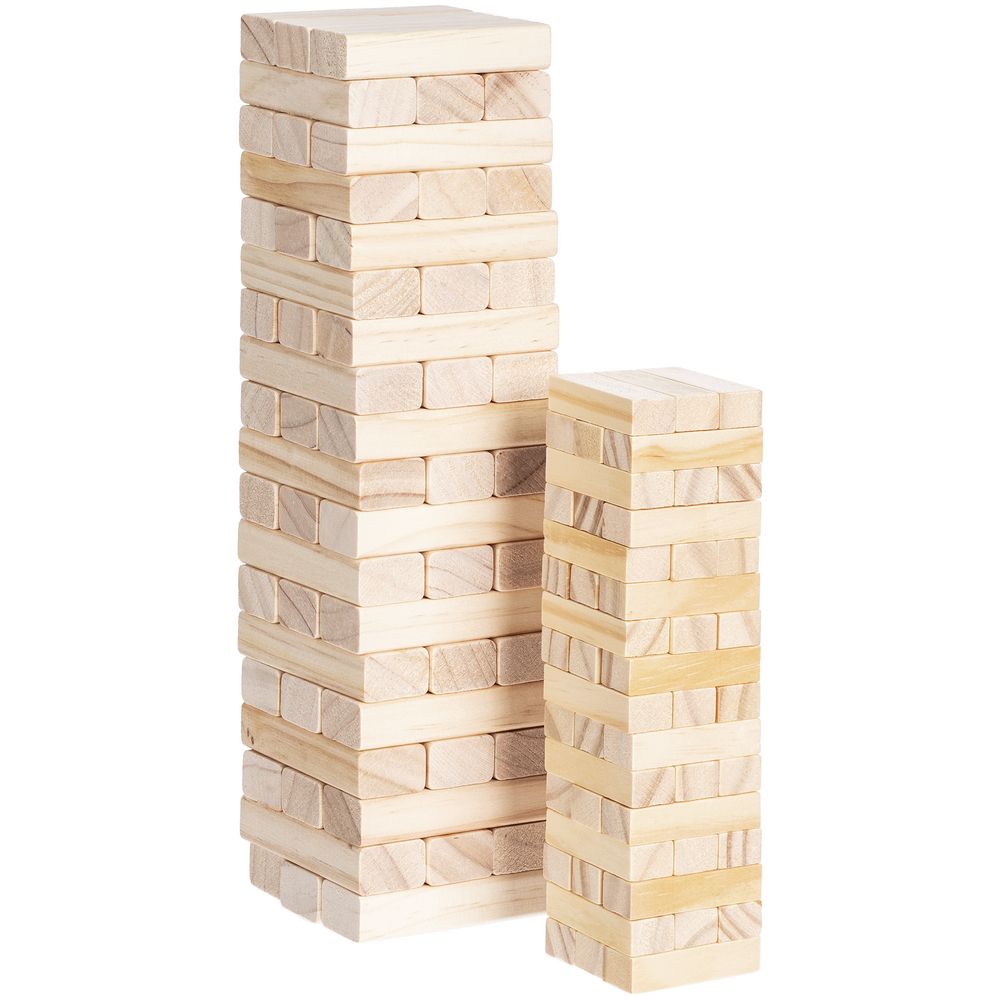 Второе название игры — «Падающая башня». Сначала строится башня: по три брусочка в ряд, каждый слой перпендикулярен предыдущему. Затем игроки по очереди вытаскивают по одному брусочку и кладут его на верх сооружения. Тот игрок, кто обрушит башню, проиграл. Игра тренирует ловкость, внимание, терпение и пространственное мышление, что очень важно и в бизнесе. Так что подарок не только развлечет, но и может стать символом-пожеланием.