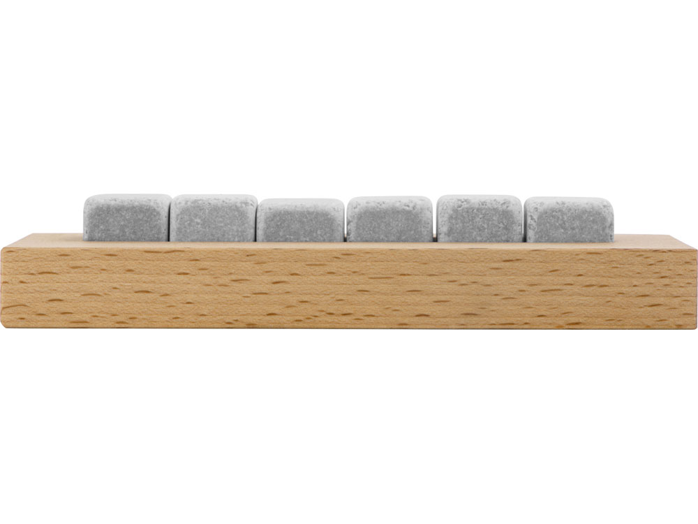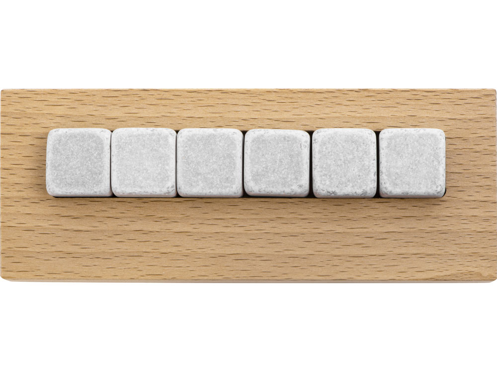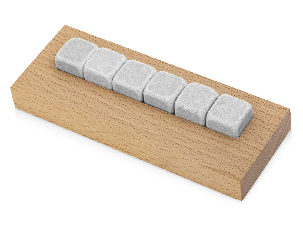 Шесть камней из талькохлорита размещены на буковой подставке, идеально помещаясь в слоте-выемке под размер. Минималистично, просто, идеально для нанесения логотипа — так вашу эмблему точно не пропустят, ведь она органично впишется в поле для брендирования.