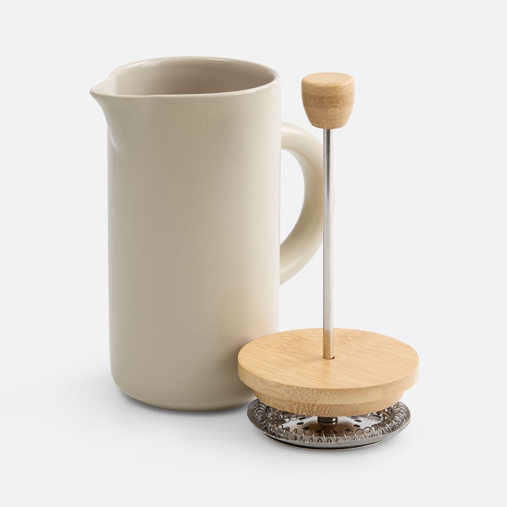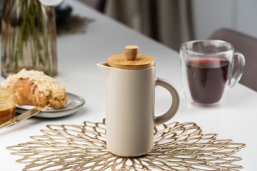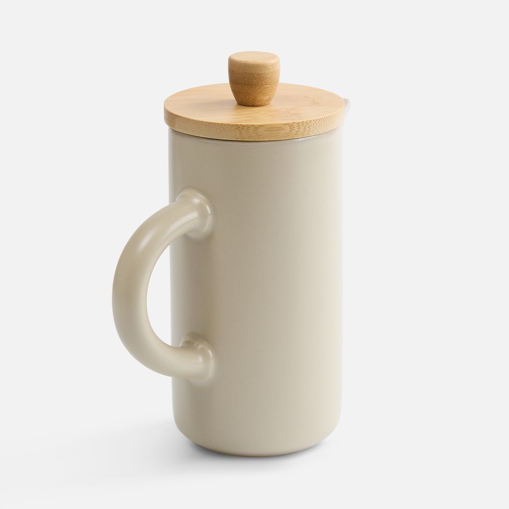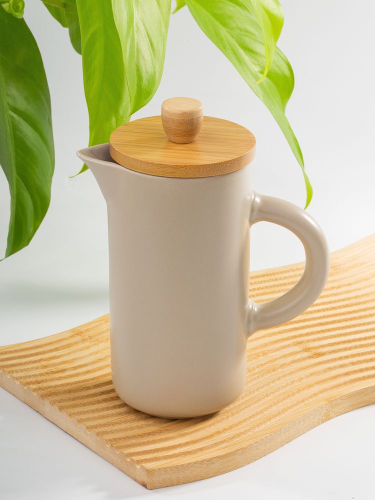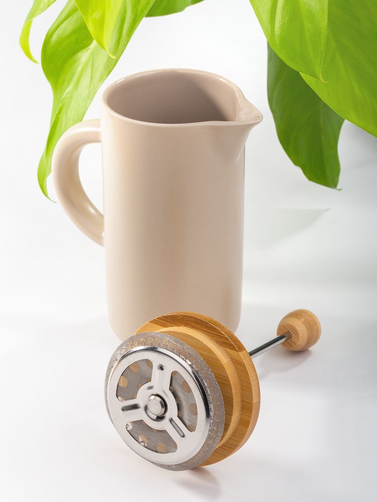 Френч-пресс Keramikk выполнен из керамики, благодаря чему он хорошо сохраняет температуру напитка, не обжигает руки и прост в уходе. Контраст бамбуковой крышки и керамики выглядит действительно интересно и необычно.Емкость 350 мл.