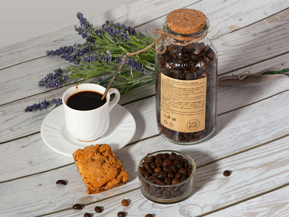 Состав: кофе натуральный жареный в зернах, палочки корицы