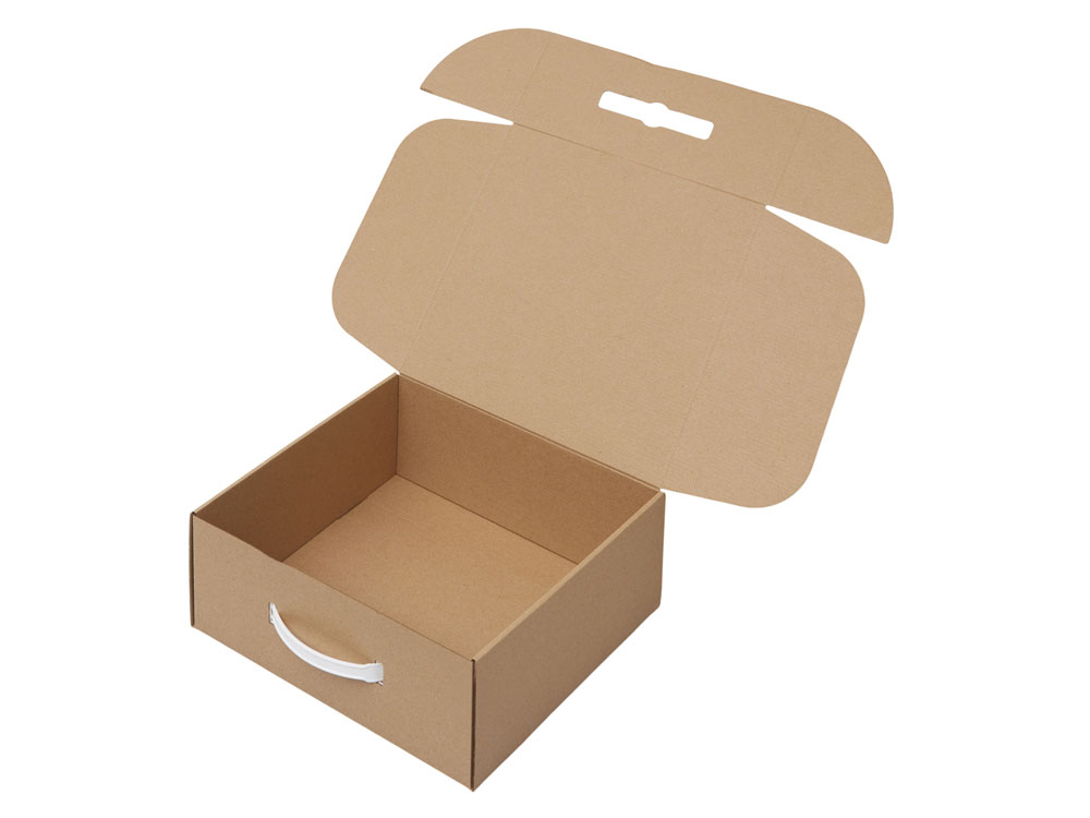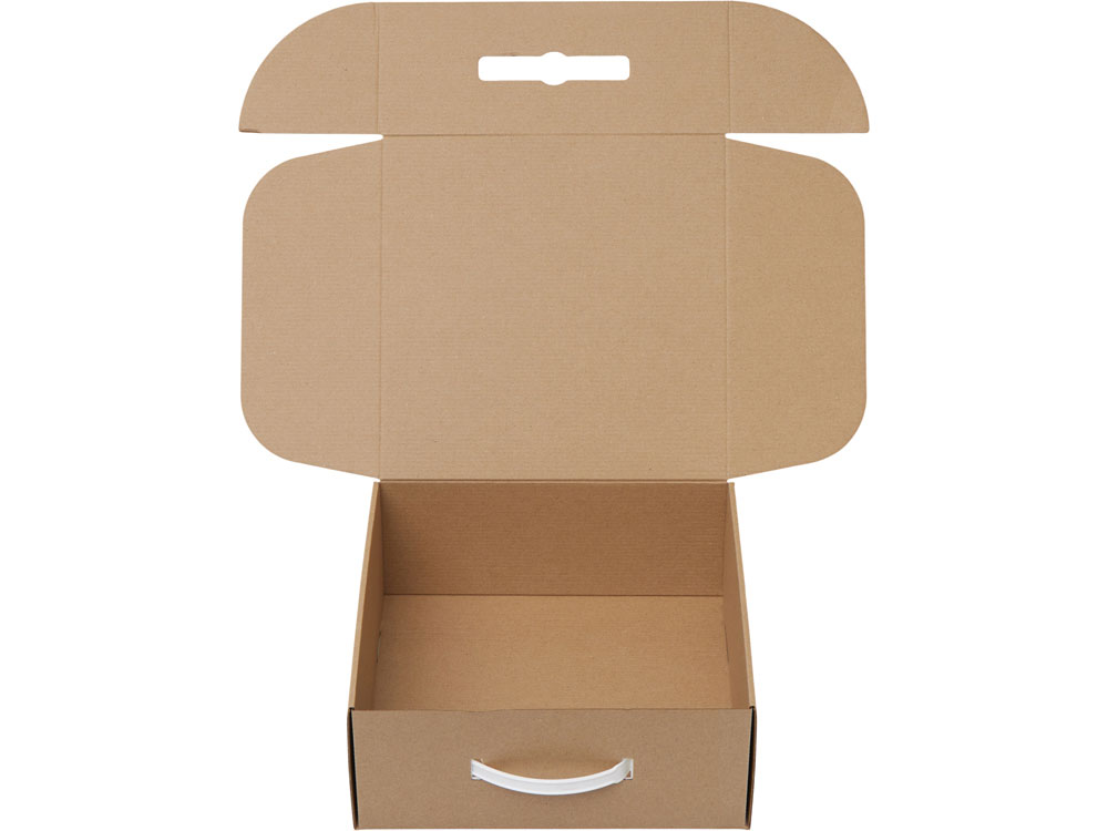 Коробка с пластиковой ручкой обеспечивает удобную функцию переноски и делает упаковку ещё более функциональной. Внутрь коробки можно поместить различные сувениры: кружку, заварочный чайник, баночку мёда или варенья. При желании можно добавить декоративный бумажный наполнитель, который подчеркнёт ваш тонкий вкус и придаст подарку завершённый вид. Съедобные товары для наполнения вы также можете заказать у нас.