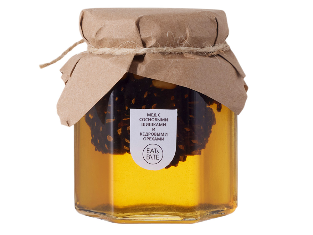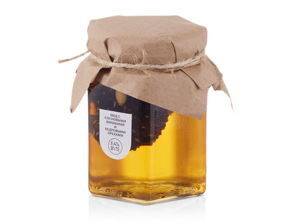 Состав: мед натуральный, сосновая шишка, ядро кедрового ореха