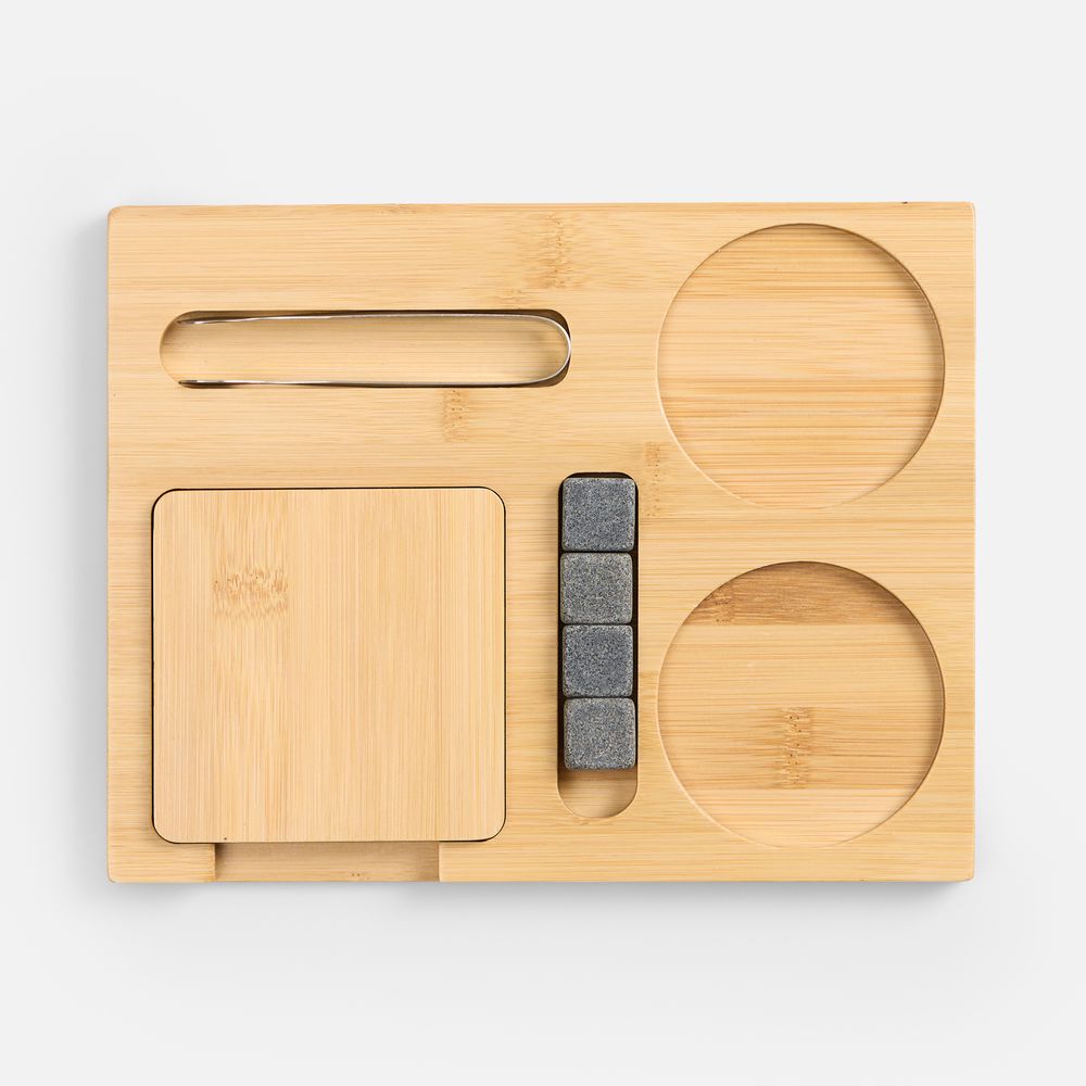 Полный арсенал для дегустации любимых сортов включает два элегантных стакана, костеры и доску из натурального бамбука для безупречной подачи, камни для охлаждения без потери глубины вкуса и удобные щипцы для их использования.