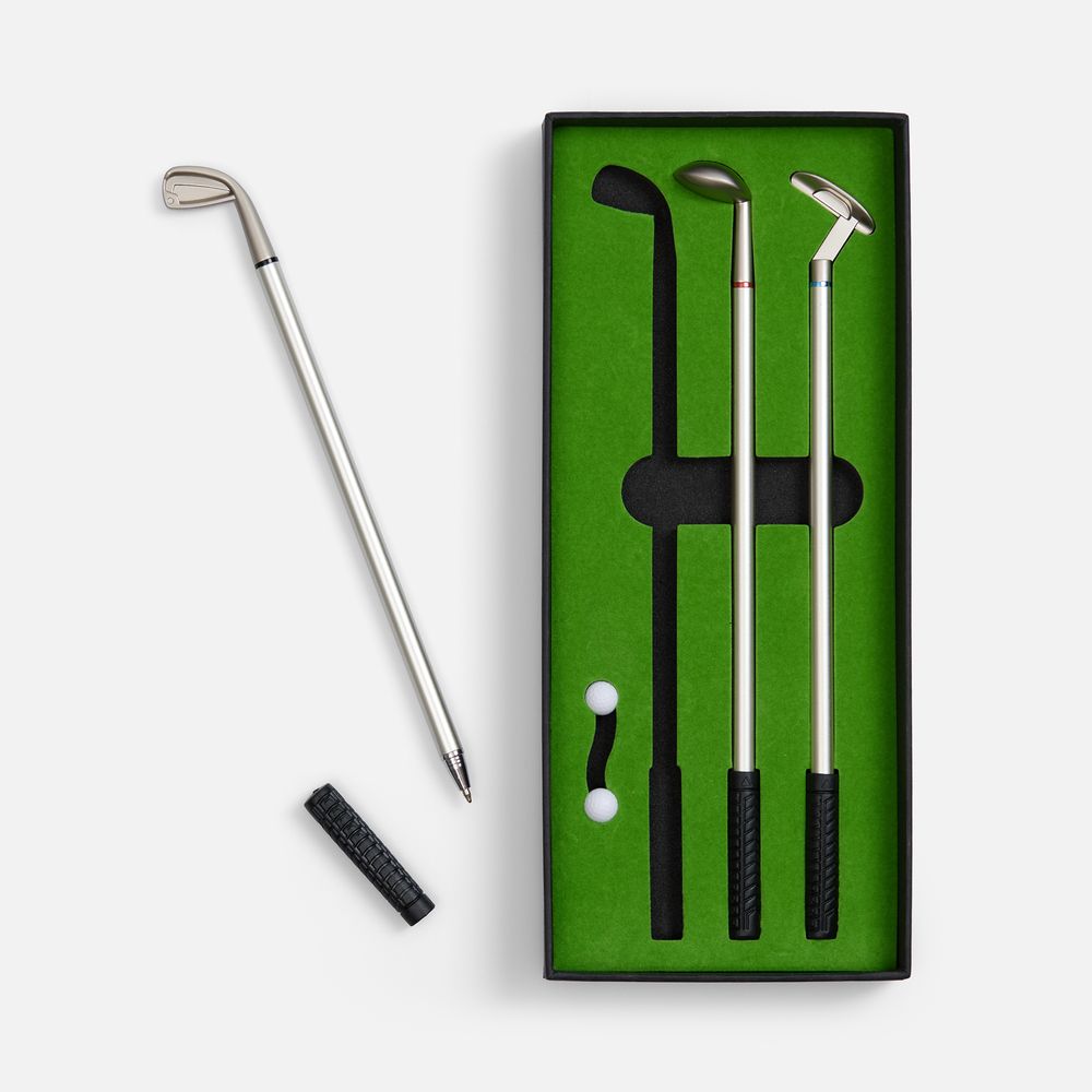 В комплекте: 3 клюшки-ручки со сменным стержнем с синими, черными и красными чернилами, 2 мячика для гольфа, флажок и подарочная коробка.Штук в коробке: 72 (объем коробки - 0.0764 м3)
