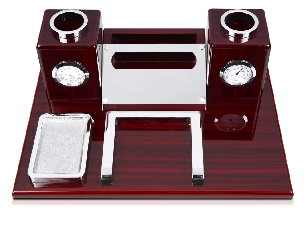 Превосходный набор из дерева благородного оттенка и металла станет отличным подарком руководителю организации. Здесь учтено все, что нужно для плодотворной работы: часы, термометр, подставки под ручки, скрепки, бумажный блок и визитки. Теперь все канцелярские принадлежности будут в порядке.