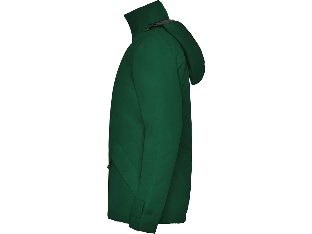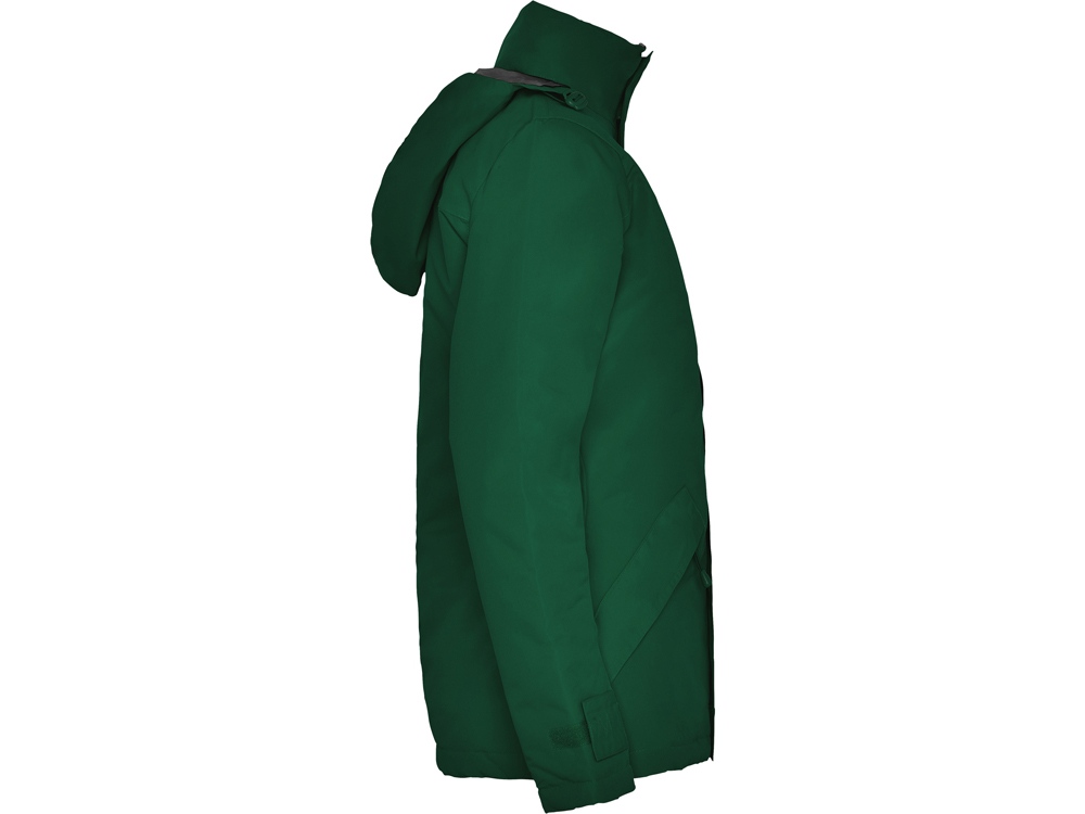 Парка прилегающего силуэта с высоким воротом застегивается на молнию в тон: