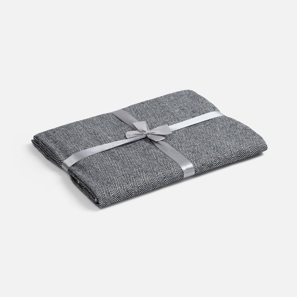 Классический рисунок «елочка» не слишком привлекает внимание, но в то же время добавляет изюминки. Смешанный состав пряжи продлевает срок службы и существенно облегчает уход за пледом.