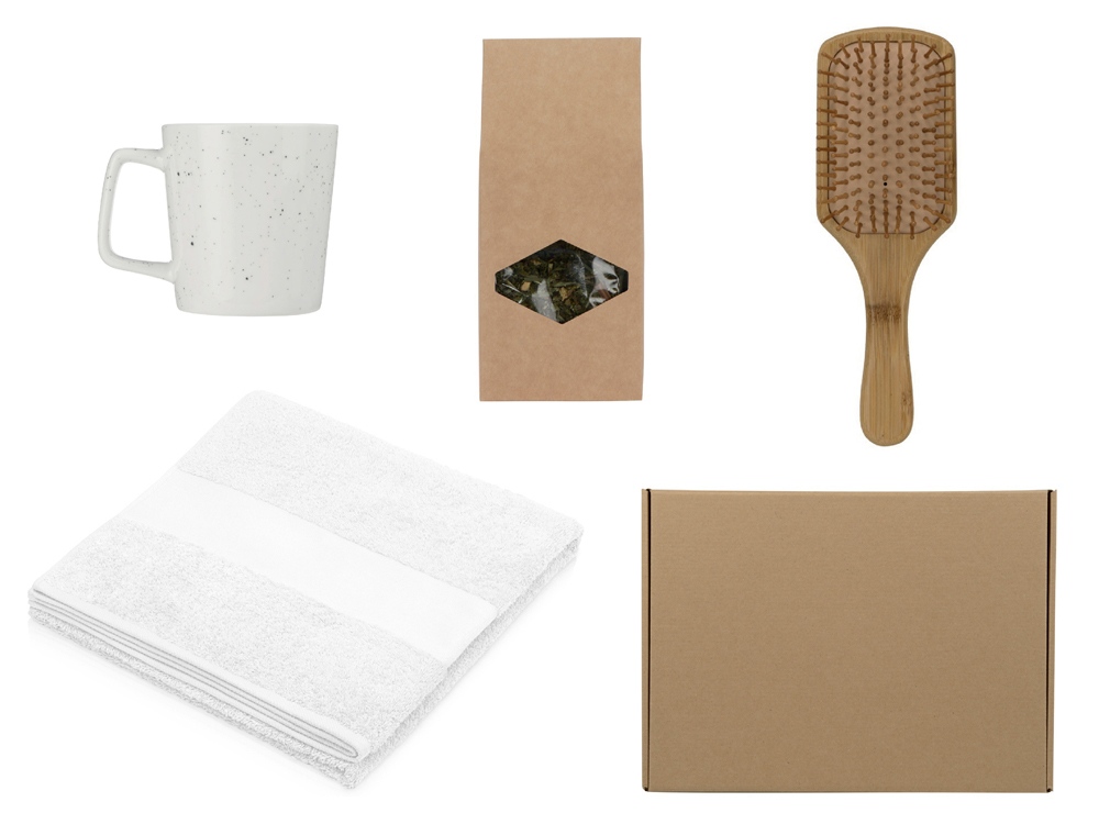 Полотенце из 100% хлопка обеспечит уют после ванны или душа. Полотенце имеет бордюр шириной 8 см. с одной стороны для нанесения логотипа (допускается незначительное отклонение по ширине). Массажная щетка для волос изготовлена из бамбука и имеет круглые и мягкие кончики, которые бережно расчесывают сухие и влажные волосы. Щетка хорошо массирует кожу головы, не травмируя ее, стимулирует кровообращение и, тем самым, улучшает рост и структуру волос. Успокаивающий травяной напиток с добавлением мяты и мелиссы скрасит любой вечер, сделает чаепитие уютным и умиротворяющим. Напиток обладает мягким успокаивающим действием, снимает стресс, расслабляет и помогает заснуть крепким сном. Кружка конусовидной формы выполнена из костяного фарфора - легкого и утонченного. Паттерн в виде брызг выделяет кружку из ряда других моделей, добавляя нотку небрежного шарма. - натуральные материалы; - размер полотенца 70±2 на 140±2 см; - кружка совместима с СВЧ-печами и посудомойками; - подарочная коробка уже в комплекте; - отличный подарок на 8 Марта