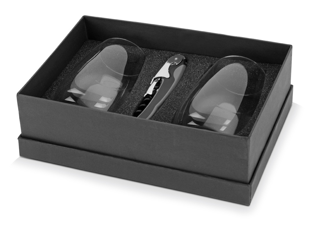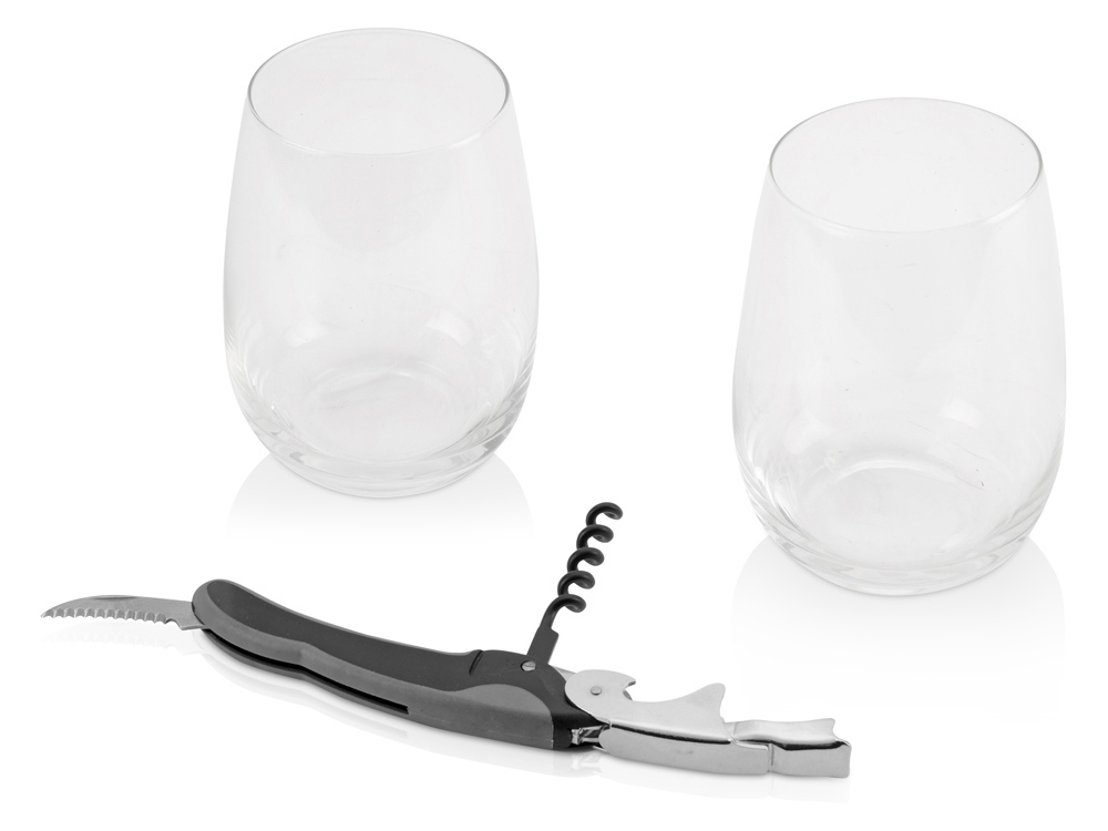 Набор состоит из двух стеклянных бокалов на 445 мл и открывалки-штопора. При желании на бокалы можно нанести логотип организации с помощью тампопечати. Отличный подарок для постоянных клиентов и деловых партнеров.
