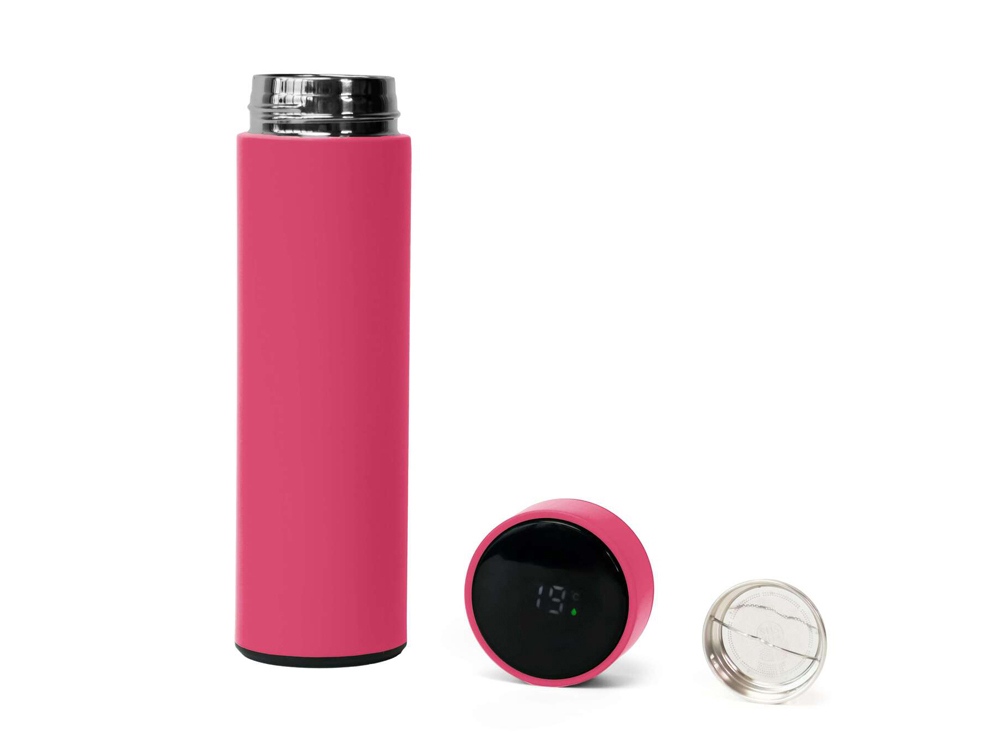 Термос выполнен из нержавеющей стали и покрыт цветным soft-touch покрытием. Его особенность — инновационная крышка со встроенным термометром и LED-дисплеем, который отображает температуру напитка внутри.