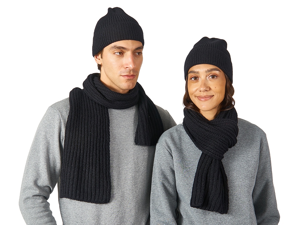 Шарф из такого же материала и с аналогичной вязкой рибом 1х1 легко драпируется, позволяя носить его как свободно, так и плотно укутываясь — в зависимости от погоды и настроения.