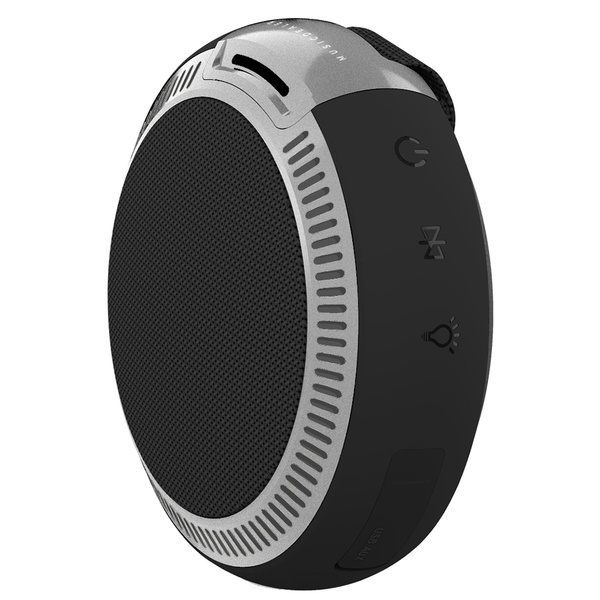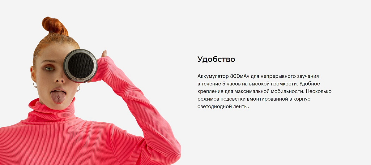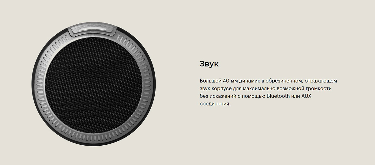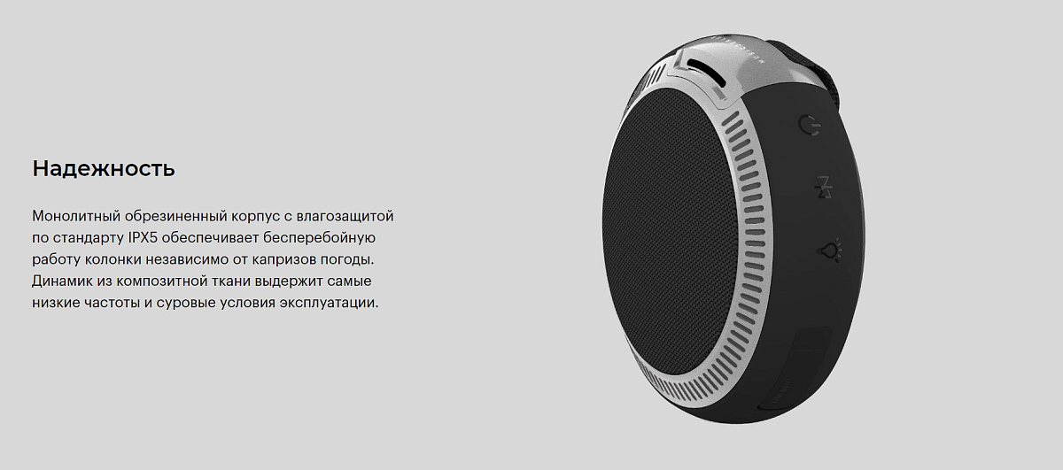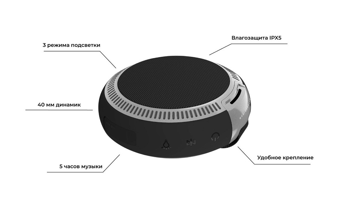 Особенности: большой 40 мм динамик в обрезиненном, отражающем звук корпусе для максимально возможной громкости без искажений с помощью Bluetooth или AUX соединения; монолитный обрезиненный корпус с влагозащитой по стандарту IPX5 обеспечивает бесперебойную работу колонки независимо от капризов погоды; динамик из композитной ткани выдержит самые низкие частоты и суровые условия эксплуатации; аккумулятор 800мАч для непрерывного звучания в течение 5 часов на высокой громкости, удобное крепление для максимальной мобильности.; несколько режимов подсветки вмонтированной в корпус светодиодной ленты; 4-5 часов работы в режиме воспроизведения музыки, полный заряд аккумулятора в течение трех часов