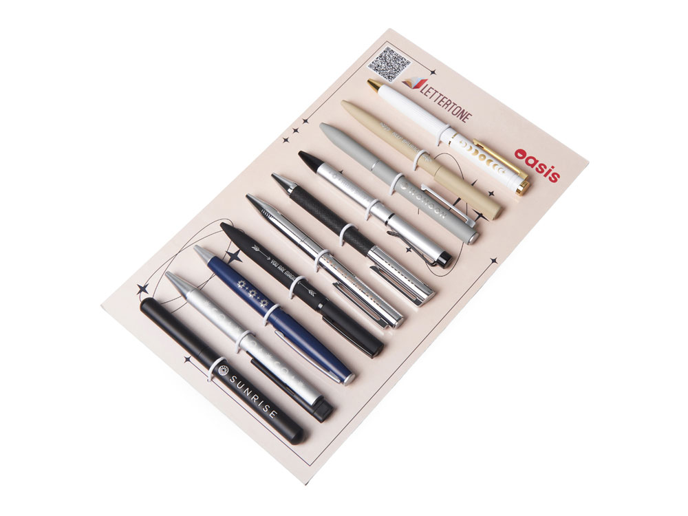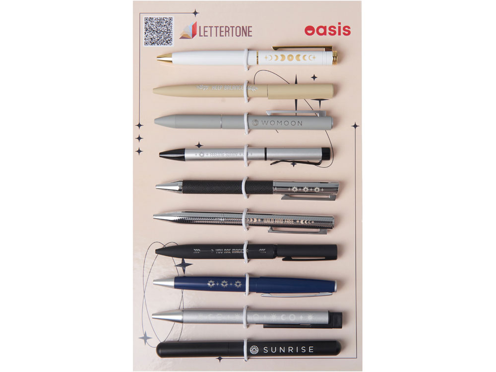 Сет металлических ручек Lettertone — это готовый презентационный комплект, включающий 10 стильных моделей ручек с примерами нанесения: гравировка и тампопечать. В сете представлены самые хитовые позиции категории ручек бренда Lettertone, а также новинки каталога периода зима-весна 2026 года. Все образцы надежно закреплены на стильной картонной подложке резиновым фиксатором. А на обратной стороне указаны названия моделей с кратким описанием. Промо-набор — идеальный инструмент для презентаций: клиенты могут подержать ручки в руках, опробовать их в деле и наглядно увидеть различия между вид