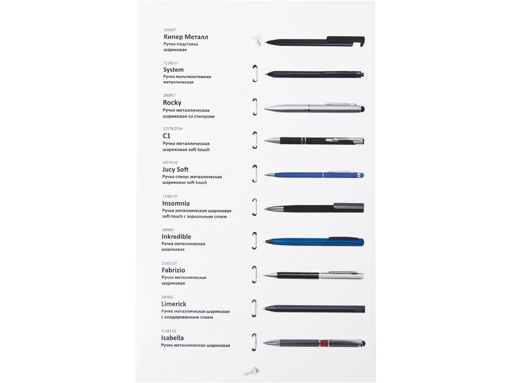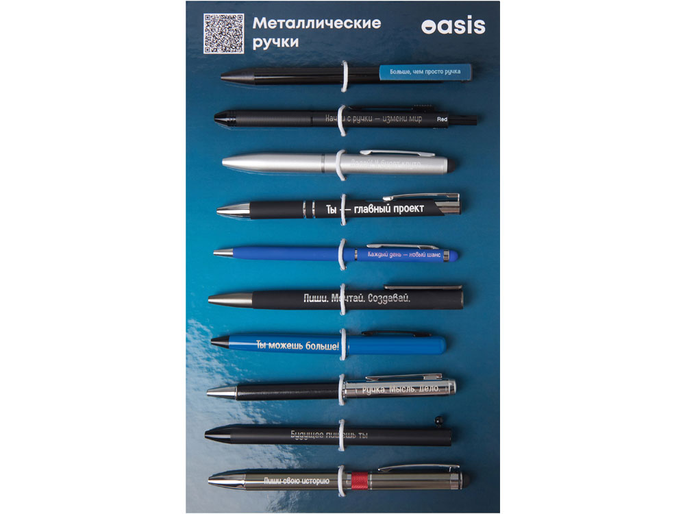 Промо-сет металлических ручек — это презентационный комплект, включающий 10 уникальных моделей с несколькими вариантами нанесения: УФ-печать, гравировка. В сете представлены самые хитовые позиции категории металлические ручки , а также новинки каталога периода зима-весна 2026 года. Все образцы аккуратно закреплены на стильной картонной подложке при помощи резинового фиксатора. На обратной стороне указаны названия и краткое описание моделей. Промо-набор — идеальный инструмент для презентаций: клиенты могут подержать ручки в руках, опробовать их на письме и наглядно увидеть различия между видами нанесения. При этом все самые важные модели собраны в одном легком и компактном наборе.