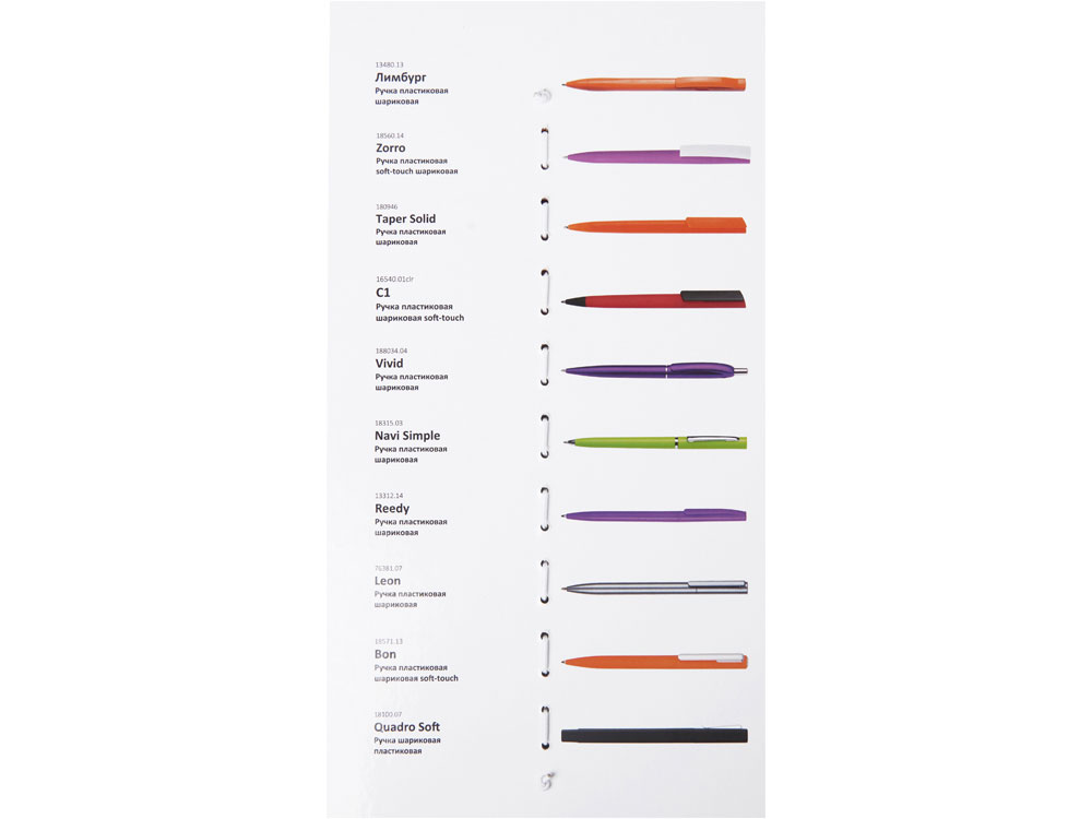 Промо-сет пластиковых ручек — это презентационный комплект, включающий 10 уникальных моделей с несколькими вариантами нанесения: УФ-печать, тампопечать и трафаретная печать. В сете представлены самые хитовые позиции категории пластиковых ручек, а также новинки каталога периода зима-весна 2026 года. Все образцы аккуратно закреплены на стильной картонной подложке при помощи резинового фиксатора. На обратной стороне указаны названия и краткое описание моделей. Промо-набор — идеальный инструмент для презентаций: клиенты могут подержать ручки в руках, опробовать их на письме и наглядно увидеть различия между видами нанесения. При этом все самые важные модели собраны в одном легком и компактном наборе.