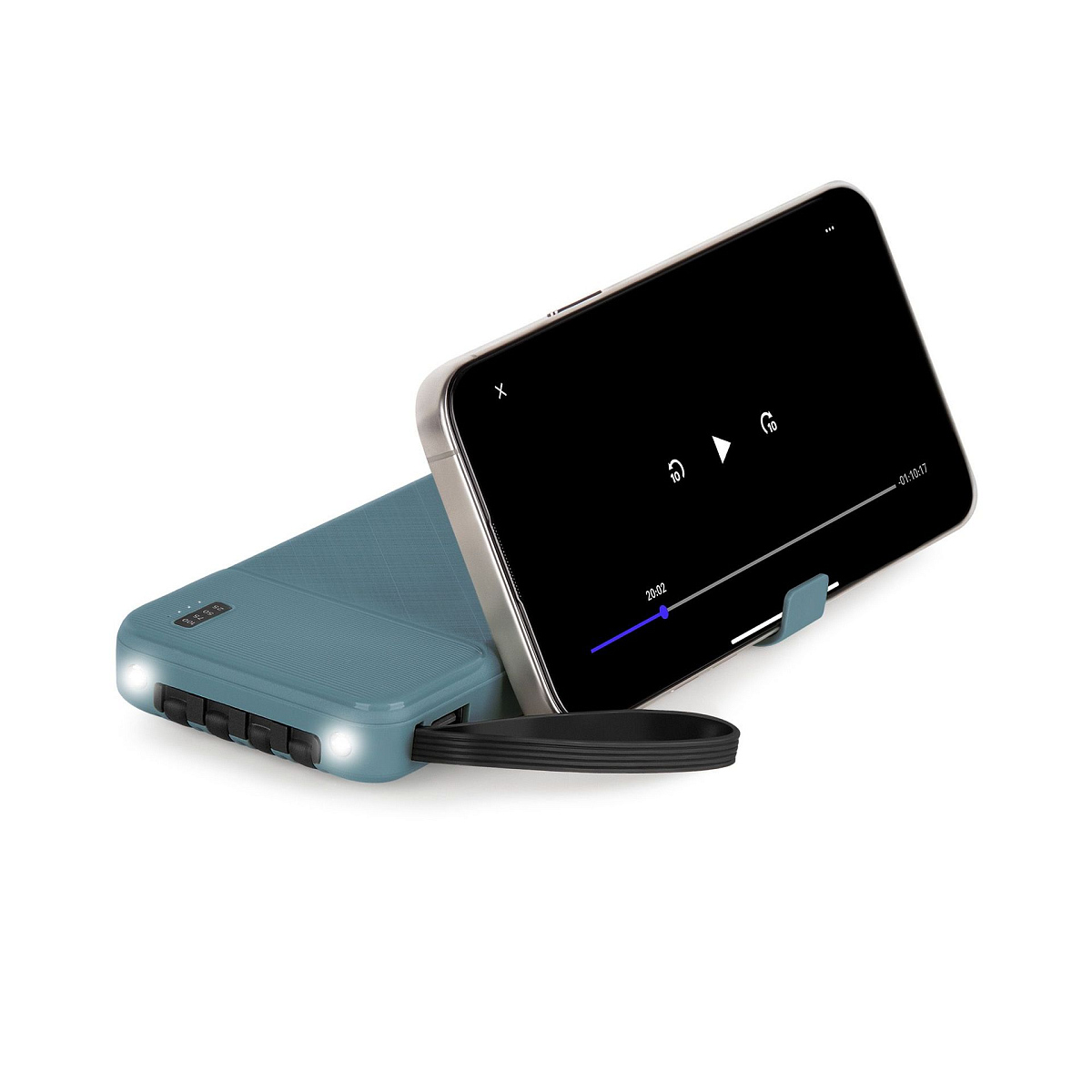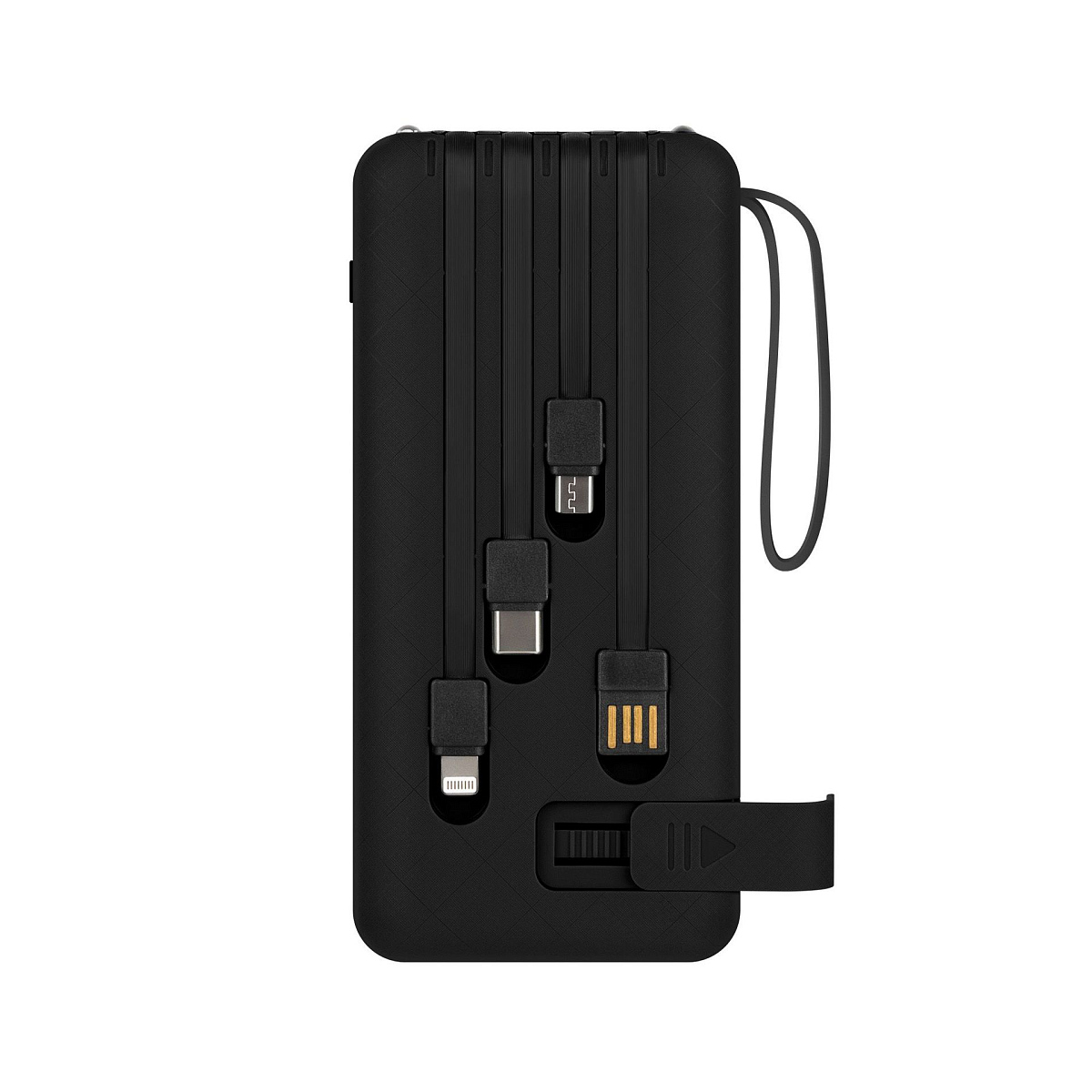 Особенности: бюджетный аккумулятор который имеет 4 встроенных провода для любого типа разъема; LED индикатор; встроенный фонарик; подставка для смартфона
