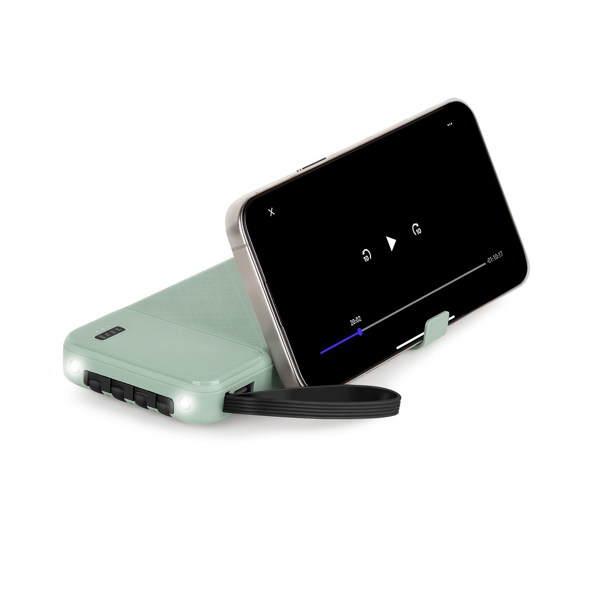 Особенности: бюджетный аккумулятор который имеет 4 встроенных провода для любого типа разъема; LED индикатор; встроенный фонарик; подставка для смартфона