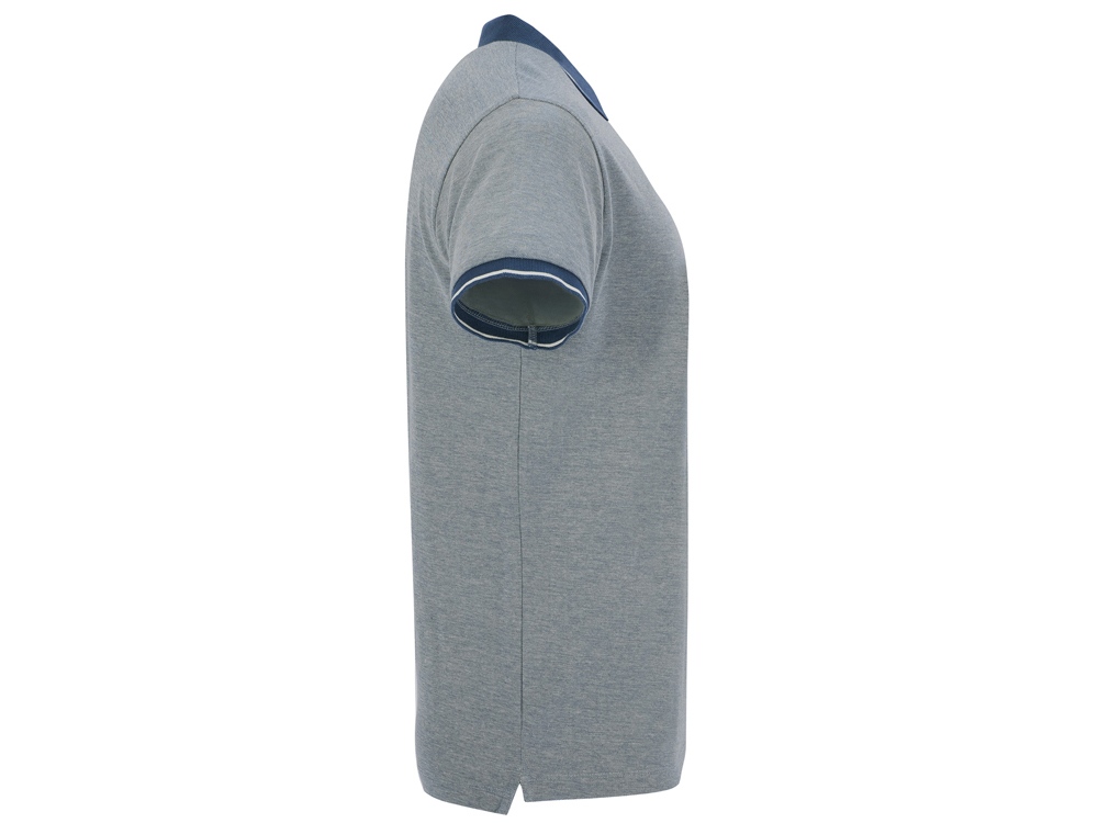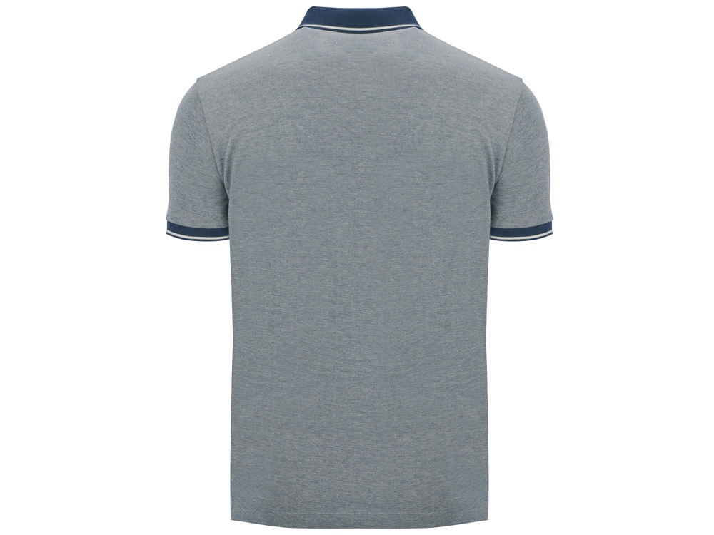 Рубашка поло с коротким рукавом. Манжеты и воротник из однотонного риба 1х1 с контрастными полосками. Планка на 3 пуговицы. Низ с боковыми разрезами, отделанными тесьмой. Спинка немного длиннее полочки. Полотно с меланжевым эффектом.