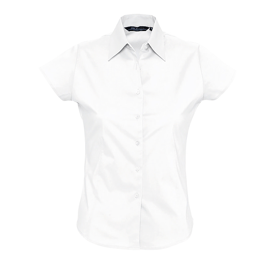 Женская рубашка с коротким рукавом из ткани стрейч. Приталенный крой. Планка на 7 пуговиц в тон изделия. Вытачка спереди и на спинке.