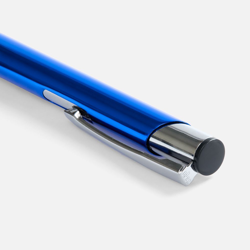 Яркая шариковая ручка с глянцевым цветным корпусом и хромированными деталями.