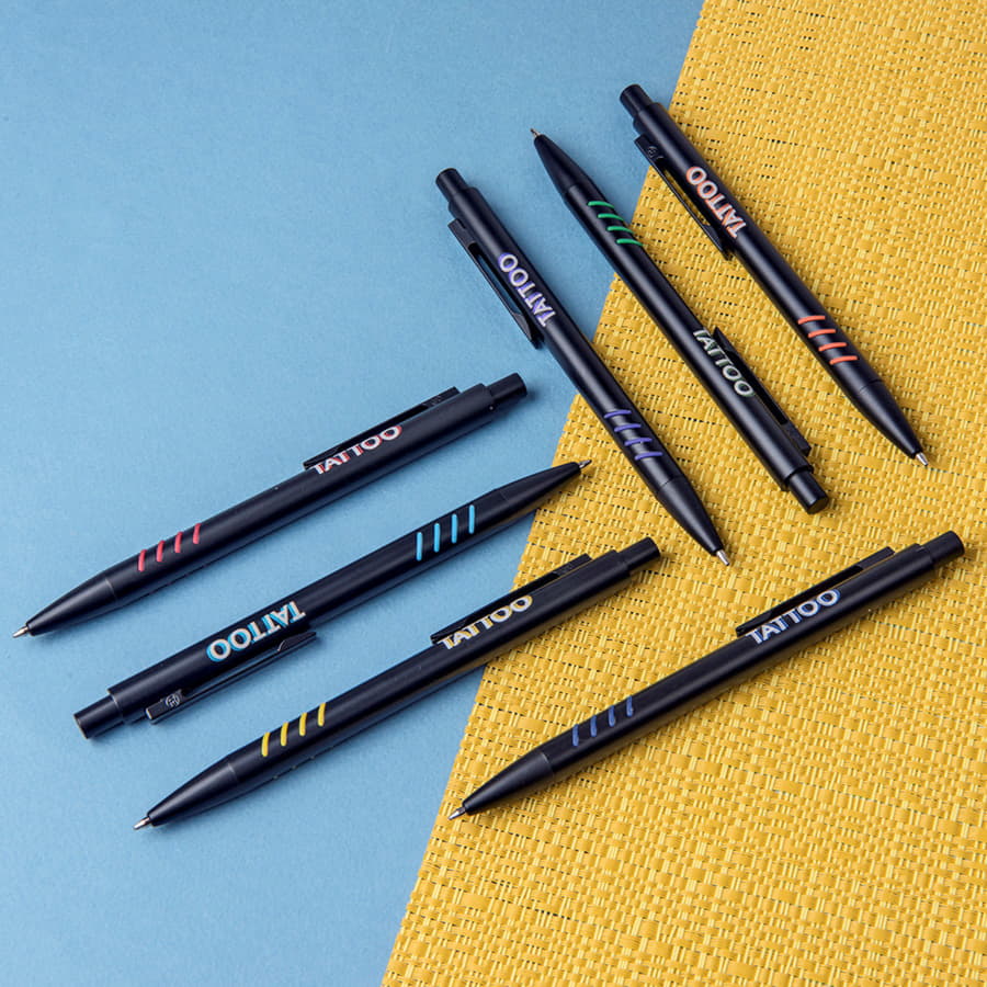 Цветные грип-вставки, контрастирующие с полностью черным корпусом - не единственная особенность TATTOO. На этой ручке возможна двухцветная 3D-гравировка. Зеркальная подложка в цвет прорезиненных вставок в сочетании с белым матовым покрытием позволяют получить эффект объема при нанесении логотипа или рекламного сообщения. Pantone, близкий к 298C.