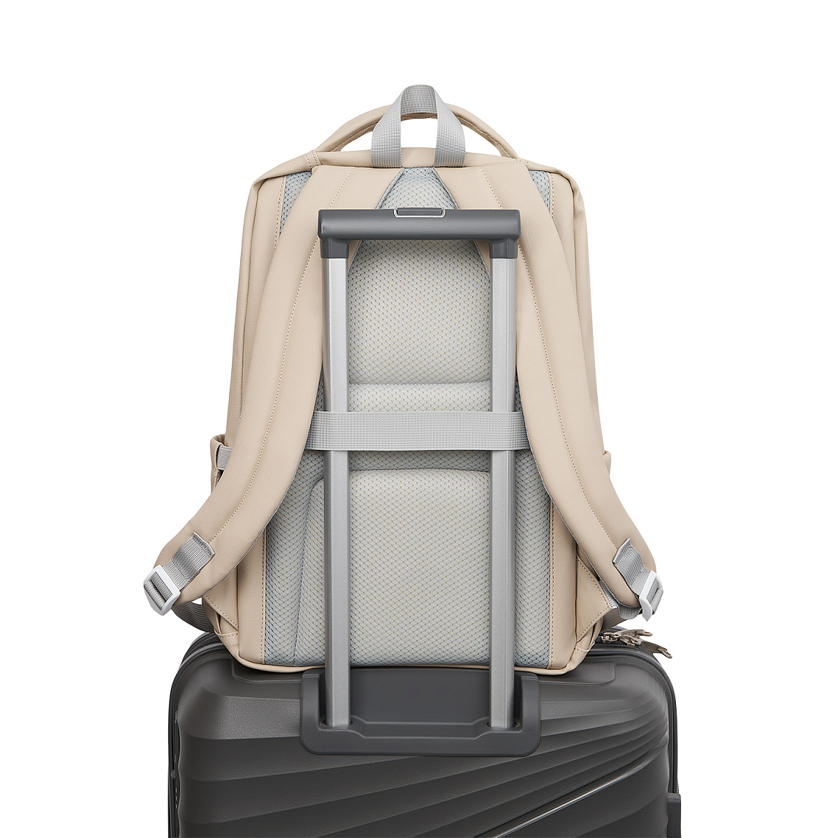На внешней стороне расположен глубокий карман на скрытой молнии для хранения мелочей, а боковые карманыоснащены фиксаторами для комфортной эксплуатации. Есть багажная лента на спинке. Рюкзак имеет две мягкие регулируемые лямки, а верхняя мягкая ручка дополнена ручкой-петлёй.