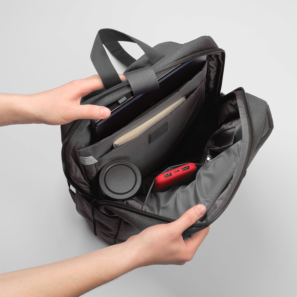 Карманы для ноутбука с диагональю до 15,6 дюймов и планшета оснащены мягкими вставками для их защиты и лентой для надежной фиксации в пути.