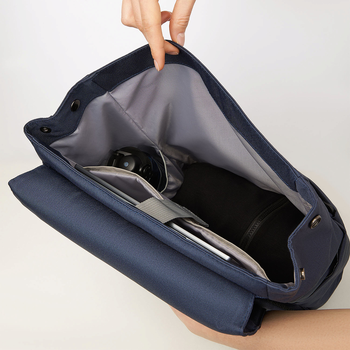 Основное отделение вмещает ноутбук до 15,6 дюймов в уплотненном кармане с фиксирующим ремнем на липучке. Внутри основного отделения есть карман для фиксации пластиковой бутылки или небольшого термоса. Боковые карманы разного типа — один объемный на молнии, второй плоский — позволяют удобно разместить все необходимые вещи.