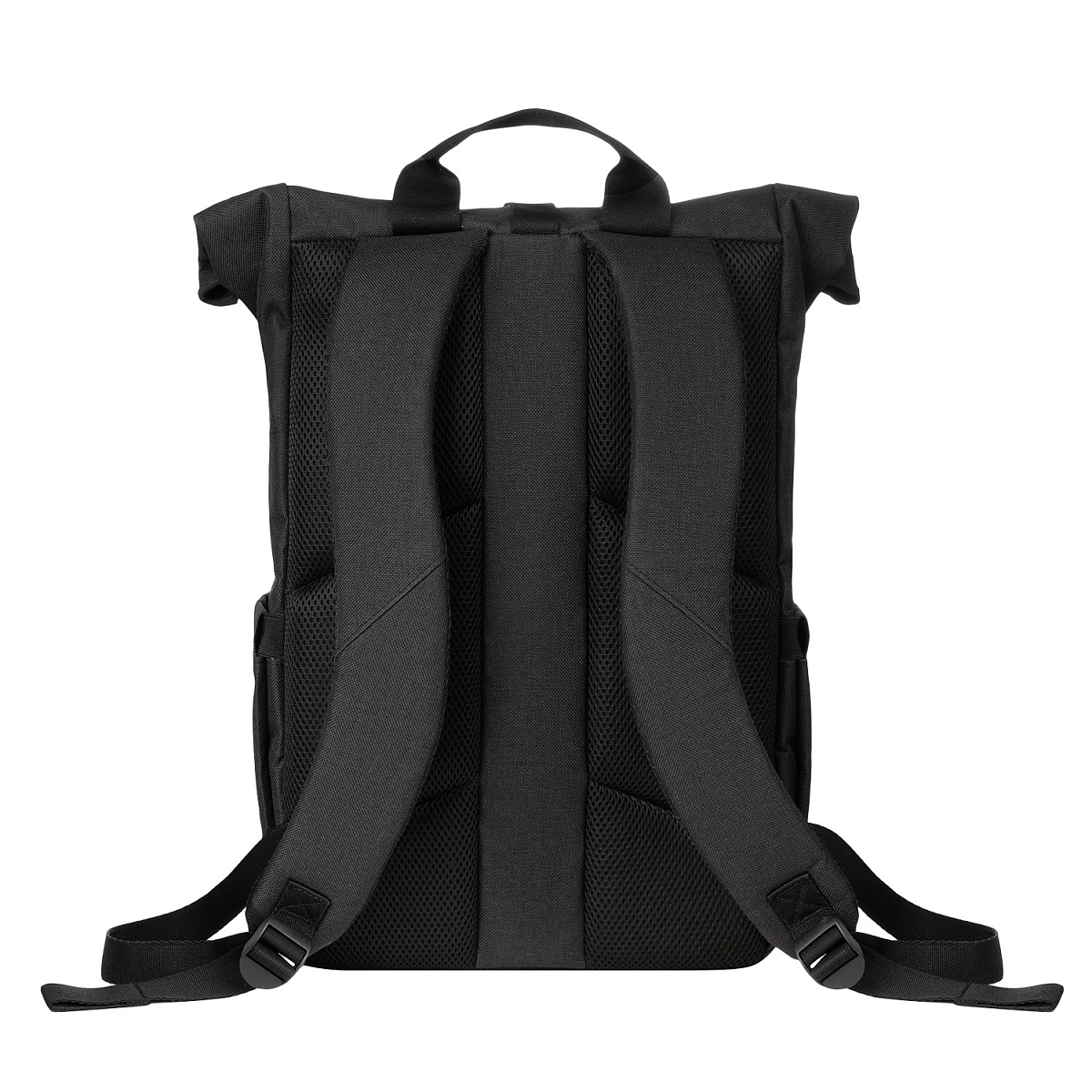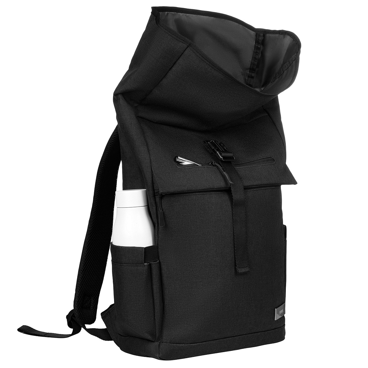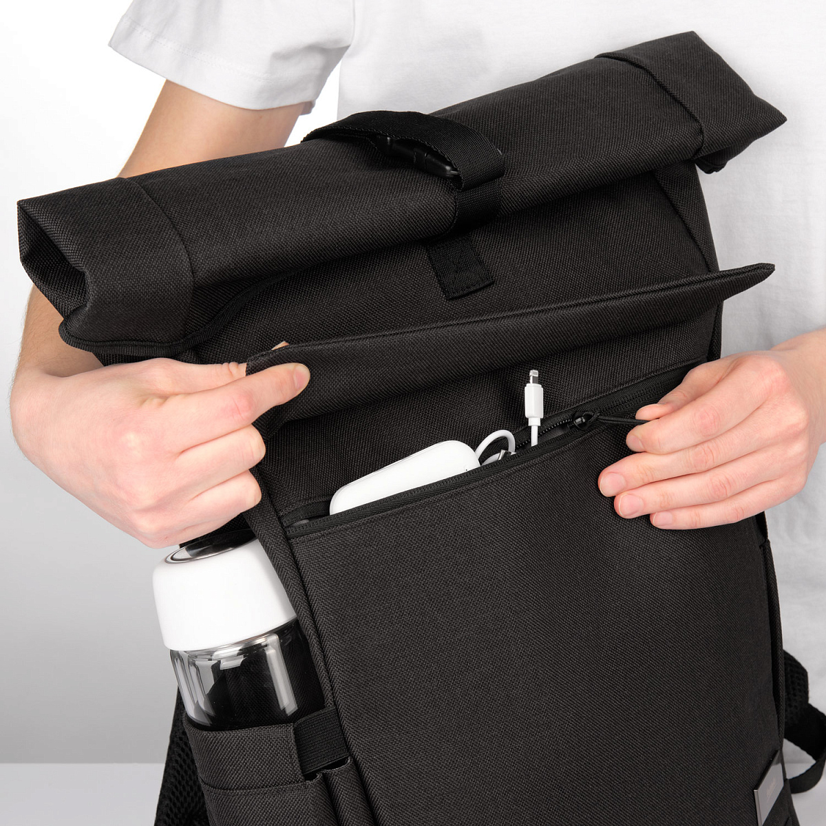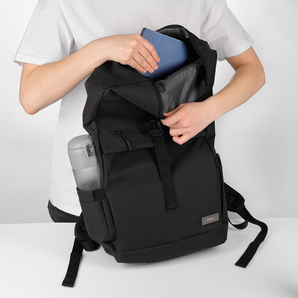 Внутри рюкзака - полный обзор содержимого за счет конструкции, которая полностью открывает отсек. Карманы для ноутбука с диагональю до 15,6 дюймов и планшета оснащены мягкими вставками для их защиты и клапаном для надежной фиксации в пути. Два небольших накладных кармашка для мелочей. Два кармана на молнии с фронтальной стороны,