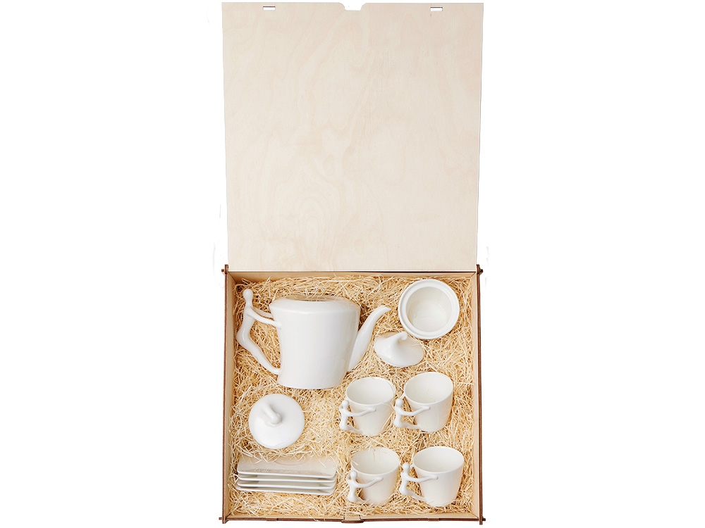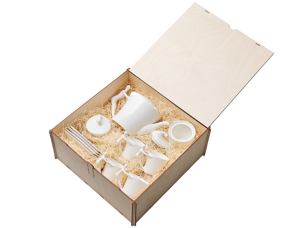 Сервиз поставляется в деревянной коробке. Вы можете нанести на нее логотип или памятную надпись. Это готовая идея для безупречного корпоративного подарка.