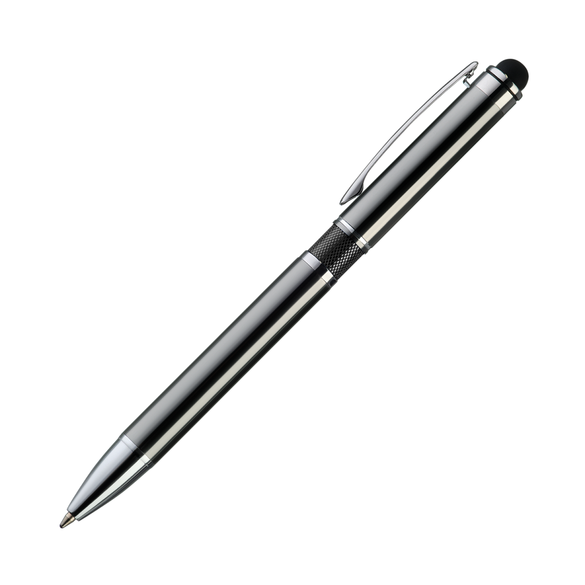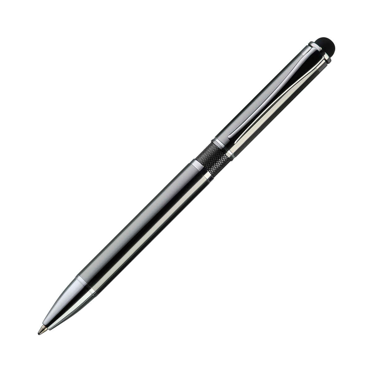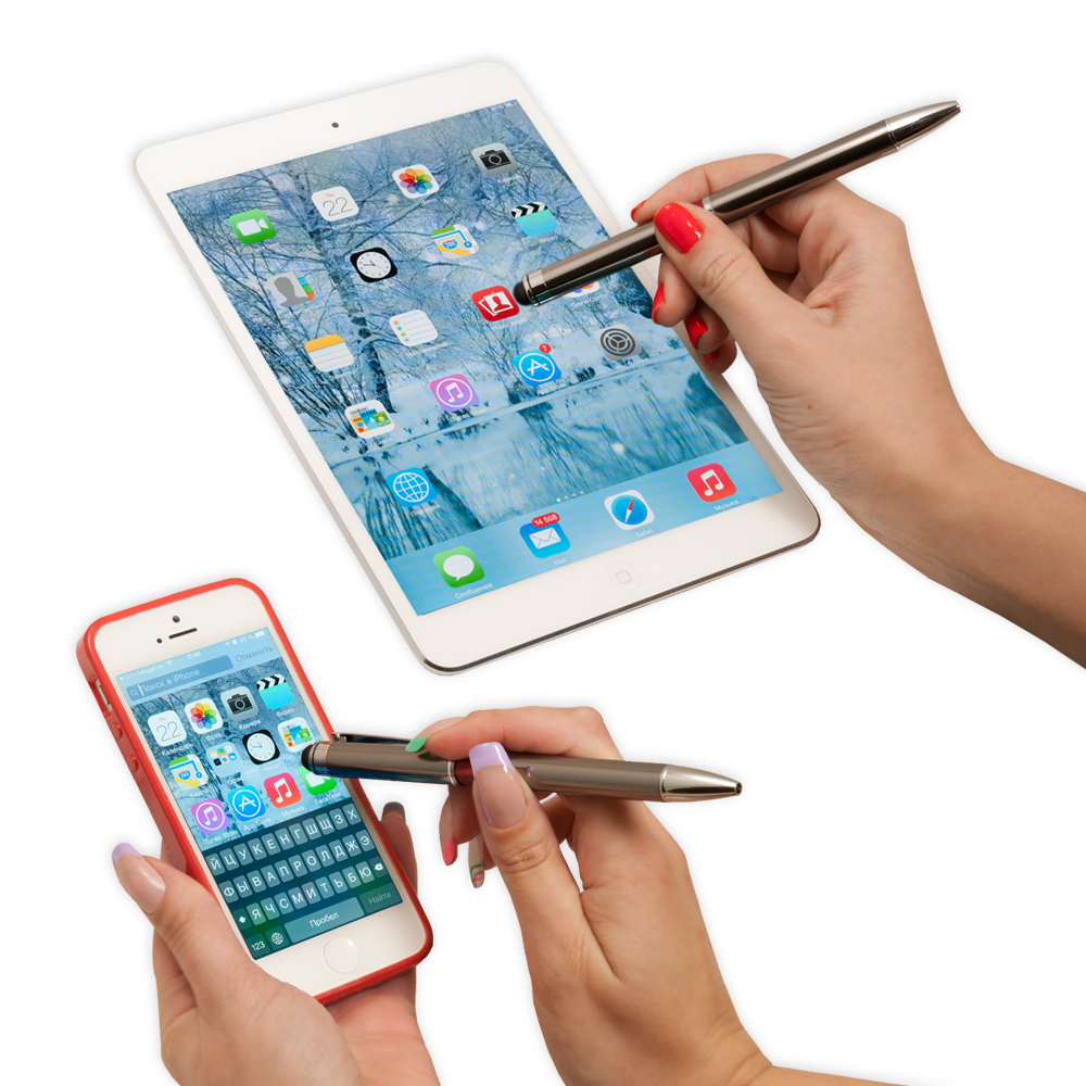 Классическая ручка цвета металлик с цветными деталями. Оснащена стилусом для работы с сенсорными экранами.